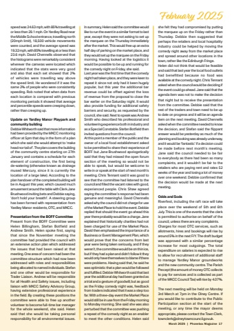 March 2025 | Phonebox Magazine 17February 2025speed was 24.63 mph, with 85% travelling at or less than 29.1 mph. On Yardley Road near the Middle School entrance, travelling north (20mph limit), 18,500 vehicle movements were counted, and the average speed was 19.32 mph, with 85% travelling at or less than 23.6 mph. David Chennells observed that the histograms were remarkably consistent wherever the cameras were located which indicated that the stats were very good and also that each set showed that 2% of vehicles were travelling way above the speed limit. He wondered if it was the same 2% of people who were consistently speeding. Rob noted that when data from each location is compared with previous monitoring periods it showed that average and percentile speeds were creeping down, rather than creeping up. Update on Yardley Manor Playpark and community buildingDebbie Whitworth said that more information had been provided by the MKCC monitoring offi cer at 5pm that day in the form of a plan which she said she would attempt to %u2018make head nor tail of%u2019. The plan covers the building of the community centre starting on 27th January and contains a schedule for each element of construction, the first being de-watering (otherwise known as drainage mused Mercury, since it is currently the location of a large lake). According to the plan handover of the completed building will be in August this year, which caused much amusement around the table with Clerk Jane Brushwood inviting bets and Debbie saying, %u2018don%u2019t hold your breath!%u2019. A steering group has been formed with representation from Yardley Manor residents, OTC, and MKCC.Presentation from the BOFF CommitteePresent from the BOFF Committee were Helen Billingham, Stefan Botfield and Andrew Smith. Helen spoke first, saying that since the November meeting the committee had provided the council with an extensive action plan which addressed the issues that had been raised at that meeting. One area of concern had been the committee structure which had now been addressed with roles and responsibilities being allocated to named individuals. Stefan and one other would be responsible for Trader Liaison. Andrew will be responsible for all Health and Safety issues, including liaison with MKCC Safety Advisory Group, having extensive professional experience in the fi eld. By creating these positions the committee were able to free up another volunteer to become full-time bar manager for the whole weekend, she said. Helen said that she would be taking personal responsibility for all environmental issues. In summary, Helen said the committee would like to run the event in a similar format to last year, except they were not asking to set up the marquee on the Thursday immediately after the market. This would free up an extra half day of parking on the market place, and they would set up the marquee on the Friday morning. Having looked at the logistics it would be possible to be up and running for the comedy night on Friday, she said. Last year was the fi rst time that the comedy night had taken place, and they were keen to repeat it since not only had it been hugely popular, but this year the additional bar revenue could be off set against the loss of revenue from the proposal to close the bar earlier on the Saturday night. It would also provide funding for additional safety barriers and security, as requested by the council, she said. Next to speak was Andrew Smith who described his professional and volunteering experience both in industry and as a Special Constable. Stefan Botfi eld then invited questions from the council. At this point a member of the public and the owner of a local food establishment asked to be permitted to share their experience of BOFF but Jane Brushwood apologetically said that they had missed the open forum section of the meeting so would not be able to speak, but would be welcome to write in or speak at the start of next month%u2019s meeting. Chris Tennant said it was good to see that the committee had listened to the council and fi lled the vacant roles with good, experienced people. Chris Shaw agreed saying the committee%u2019s response had been genuine and meaningful. David Chennells asked why the council did not charge for use of the Market Place to hold the event. Debbie replied that should the event go ahead this year there probably would be a charge. Jane explained that historically charities had not been charged for use of the Market Place. David then emphasised the importance of a Business or Event Management Plan, which would prove that the concerns from last year were being taken seriously, and if they weren%u2019t, the committee would be on thin ice, but if they had a plan and didn%u2019t follow it they would only have themselves to blame if there were problems. Having said that, he said he was optimistic that a plan would be followed and fulfi lled. Debbie Whitworth said that last year the additional day had been granted as a trial and a gesture of goodwill, but as good as the Friday comedy night was, feedback from traders indicated that it was a step too far. With a three-day event the Market Place would still be in use from the Friday morning to Monday morning. She said she was also perturbed that the committee was pushing a repeat of the comedy night as an enabler to meet the other conditions. Helen said she felt they had compromised by putting the marquee up on the Friday rather than Thursday. Debbie then suggested that perhaps the retailers and local hospitality industry could be helped by moving the comedy night away from the market place and spread around other locations in the town, rather like the Edinburgh Fringe. Helen did not think that would be feasible and said that last year the local food outlets had benefitted because no food was available at the comedy night. Chris Tennant asked when the council would be deciding if the event could go ahead. Jane said that the agenda item was not to m