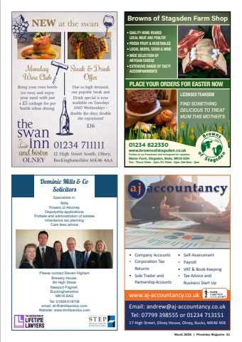 March 2025 | Phonebox Magazine 31%u2022 Company Accounts%u2022 Corporati on Tax Returns%u2022 Sole Trader and Partnership AccountsEmail: andrew@aj-accountancy.co.ukTel: 07799 398555 or 01234 71315117 High Street, Olney House, Olney, Bucks, MK46 4EB%u2022 Self-Assessment%u2022 Payroll%u2022 VAT & Book-Keeping%u2022 Tax Advice and Business Start Upwww.aj-accountancy.co.ukDominic Mills & CoSolicitorsSpecialists in:WillsPowers of AttorneyDeputyship applicationsProbate and administration of estatesInheritance tax planningCare fees advicePlease contact Steven HighamBrewery House, 84 High StreetNewport Pagnell, BuckinghamshireMK16 8AQTel: 01908 618708email: sh@dmillsandco.comWebsite: www.dmillsandco.comwww.brownsofstagsden.co.ukFollow us on Facebook and Instagram for updatesManor Farm, Stagsden, Beds, MK43 8SHTue - Thurs 10am - 4pm, Fri 10am - 5pm, Sat 9am - 3pmLICENSED TEAROOMFIND SOMETHING DELICIOUS TO TREAT MUM THIS MOTHER%u2019S 01234 822330Browns of Stagsden Farm Shop %u2022 QUALITY HOME REARED LOCAL MEAT AND POULTRY%u2022 FRESH FRUIT & VEGETABLES %u2022 LOCAL BEERS, CIDER & WINE%u2022 WIDE SELECTION OF ARTISAN CHEESE%u2022 EXTENSIVE RANGE OF TASTY ACCOMPANIMENTS PLACE YOUR ORDERS FOR EASTER NOW12 High Street South, Olney, Buckinghamshire MK46 4AA01234 711111Steak & Drink OfferDue to high demand, our popular Steak and Drink special is now available on Tuesdays AND Wednesdays %u2013 double the days, double the enjoyment! %u00a316Monday Wine ClubBring your own bottle (or two) and enjoy your meal with just a %u00a35 corkage fee per bottle when dining. NEW at the swan