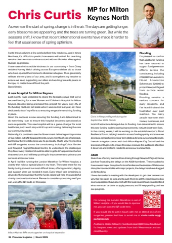36 Phonebox Magazine | March 2025As we near the start of spring, change is in the air. The days are getting longer, early blossoms are appearing, and the trees are turning green. But while the seasons shift, I know that recent international events have made it harder to feel that usual sense of spring optimism.I write these columns a few weeks before they reach you, and in times like these, it%u2019s diffi cult to predict how events will unfold. But one thing remains clear: we must continue to stand with our Ukrainian allies against Russian aggression.I have seen the incredible kindness in our community %u2013 from Olney resident Harvey Welch driving across Europe to deliver aid to those who have opened their homes to Ukrainian refugees. Their generosity refl ects the very best of our area, and it strengthens my resolve to ensure we keep supporting our allies and working towards peace in Europe, no matter how diffi cult the path.Slava Ukraini.A new hospital for Milton KeynesLast month, I was delighted to share the fantastic news that we%u2019ve secured funding for a new Women and Children%u2019s Hospital for Milton Keynes. Despite being promised this project for years, only 4% of the funding had been set aside when I was elected last year, so I have dedicated a lot of my eff orts to ensuring we get the remaining funding in place. Given the success in now securing the funding, I am determined to do everything I can to ensure this hospital becomes operational as soon as possible. This new hospital will be a game-changer for local healthcare, and I won%u2019t stop until it%u2019s up and running, delivering the care our community needs.Nationally, it%u2019s positive to see the Government delivering on its promise of two million extra NHS appointments, seven months ahead of schedule, but I know there%u2019s still a long way to go locally. That%u2019s why I%u2019m meeting with GP surgeries across the constituency, including Cobbs Garden and Newport Pagnell Medical Centre, to understand the challenges they face. Every resident should be able to get a GP appointment when they need one, and I will keep pushing for improvements to primary care services across our area.In April, I will be running the London Marathon for Willen Hospice, a charity that holds a special place in my heart. They were there for my family during some of our most diffi cult times, off ering comfort, dignity, and support when we needed it most. Every step I take in training is driven by the knowledge that the funds raised will help this wonderful charity continue its vital work. Please do consider sponsoring me if you can, using the QR code on this page. Chris Curtis MP for MiltonKeynes NorthFloodingI%u2019m pleased to confirm that additional funding has been secured to support fl ood prevention efforts across the constituency, including %u00a3150,000 for Lavendon%u2019s F l o o d A l l e v i a t i o n Scheme and %u00a320,000 to protect Newport Pagnell from surface water fl ooding.Flooding remains a serious concern for many residents, and I%u2019ve heard fi rsthand the frustration over past inaction. Too many people have seen their homes, businesses, and local infrastructure damaged due to fl ooding. I am determined to ensure this new funding leads to lasting improvements, not just short-term fi xes. In the coming weeks, I will be working on the establishment of a Flood Resilience Forum, helping Lavendon access funding quickly and ensure we develop a comprehensive, long-term strategy to keep our communities safe.I remain in regular contact with both Milton Keynes City Council and the Environment Agency to ensure this issue receives the sustained attention it deserves and protects residents across our communities.A509Given how often my team and I are driving through Newport Pagnell, I know just how frustrating the delays on the A509 have been. These roadworks have caused major disruption for local families and businesses. While some disruption is unavoidable with major projects, the delays here have dragged on far too long.I have demanded a meeting with the developers to get clear answers on why this has taken so long and to push them to get the road reopened as soon as possible. I have also met with the local council team to understand what more can be done to apply pressure, and I%u2019ll keep pushing until we see progress.I%u2019m running the London Marathon in aid of Willen Hospice %u2013 if you would like to sponsor me, you can scan the QR code here.If you would like to get in touch with me or attend one of my surgeries, please feel free to email me at chris.curtis.mp@parliament.ukAs always, please follow my Facebook page (@ChrisCurtisLabour) for frequent news and updates from both Westminster and our constituency. Milton Keynes MPs work together on hospital expansionChris in Newport Pagnell during the September 2024 Floods