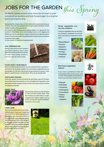 March 2025 | Phonebox Magazine 45As March comes around once more, we can start to peer outside at our gardens and look forward again to a brighter and more hopeful time.Spring signifi es longer days, shorter nights and a general warming up of the air. And with that, gardens start to gain colour and bloom as the %u2018slower%u2019 months of the year depart.It%u2019s a time to start thinking about getting seeds in the ground for the summer%u2019s fl owerbeds, which will probably involve some digging and fertilising to get the soil ready, to support climbers that might have blown loose in the wind and to clear the garden paths ready for ground creepers to smother them again. In other words, it%u2019s sowing and growing time!SOIL PREPARATIONSpring is the perfect time to prepare your soil for planting. Have a good tidy round, removing weeds and grass and add in some quality compost or manure to give the earth a boost.PLANT EARLY VEGETABLES March and April are good months to sow and plant hardier vegetables %u2013 all of which can be grown outside. The more tender vegetables that are susceptible to frost and cold should be germinated and grown under glass in a greenhouse or conservatory. They can go outside later.FERTILISER FEEDINGFeed your garden shrubs and plants by sprinkling a general fertiliser around their base. Some plants, such as camellias and magnolias, need specialist mixtures. A garden shop can help. Give roses a spray of insect and disease controller.SWEET PEASThe next two months are also the best to sow and plant sweet peas. They like moisture, so plant them in a wellirrigated area. Organic matter, such as mulch, can improve moisture retention. Ensure it%u2019s not too cold.LAWN CARENow is an important time for your longsuff ering lawn. It has had a tough few months of frost, rain and general poor conditions, and now is the time for it to %u2018come to life%u2019 again. Remove debris and rotting leaves with a rake, aerate it to help root growth and add in some fertiliser if necessary. Regular mowing will promote growth as long as the lawn is not sodden when you start.JOBS FOR THE GARDENHardy vegetables you can sow outdoors:These are vegetables that can be sown into fertilised, ventilated soil and left alone, even when it is still quite cold at night. %u2022 Broad Beans%u2022 Carrots%u2022 Spinach%u2022 Potatoes%u2022 Turnips%u2022 Radishes%u2022 LettuceStart these vegetables indoors:If you have a greenhouse there are several plants that can be sown for early summer. These will also grow inside your home if you don%u2019t have a glass house.%u2022 Squash%u2022 Kohl Rabi%u2022 Tomatoes%u2022 Aubergines%u2022 Cucumbers%u2022 Celery%u2022 Sweet peppers