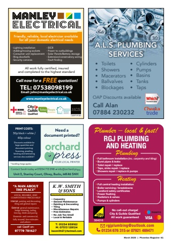 March 2025 | Phonebox Magazine 61A.L.S. PLUMBING SERVICESCall Alan07884 230232OAP Discounts available%u2022 Toilets%u2022 Showers%u2022 Macerators%u2022 Ballvalves%u2022 Blockages%u2022 Cylinders%u2022 Pumps%u2022 Basins%u2022 Tanks%u2022 Taps Friendly, reliable, local electrician available for all your domestic electrical needs- Lighting installation - Adding/moving sockets - Consumer unit replacement- Ring doorbells- Security cameras- EICR- Power to outbuildings- Solar Panels/Battery storage- Extension/conservatory wiring- Fault findingAll work fully certified, insuredand completed to the highest standard Call now for a quotation!www.manleyelectrical.co.ukTEL: 07538098199Email: john@manleyelectrical.co.ukFREEPlumber %u2013 local & fast!RGJ PLUMBING AND HEATINGPlumbing %u2022 Full bathroom installation (inc. carpentry and tiling)%u2022 Burst pipes & leaks%u2022 Toilet repair / replace%u2022 Taps, sinks repair / replace%u2022 Showers repair / replace & pumpsHeating %u2022 Full central heating installation%u2022 Boiler servicing / breakdowns%u2022 Landlord safety certifi cates%u2022 Power fl ushing%u2022 Radiators & valves%u2022 Pumps & cylinders564016No call-out charge!City & Guilds Qualifi edAll work guaranteed rgjplumbing@outlook.com01234 676 315 or 07921 469471LOCAL, RELIABLE, AND COMPETITIVELY PRICED HELP Internal: painting and decorating,tiling and general repairsExternal: general maintenance, hedge trimming, turfing, fencing, sheds and pavingDomestic and commercial, fully insured, free estimates and advice.%u201cA MAN ABOUT THE PLACE%u201dcall Geoff on:07770 781627K .W . SMITH& SONS%u2022 Carpentry %u2022 General Maintenance%u2022 Painting & Decorating%u2022 Tiling%u2022 Miscellaneous Repairs%u2022 Free Estimates%u2022 No Job Too Small%u2022 Local & ReliableT: 01234 959162M: 07513 129124kwsmith57@hotmail.comContact Sarah today 01234 713 298 info@orchard.pressUnit 2, Stanley Court, Olney, Bucks, MK46 5NH PRINT COSTS: 30p black + white /60p colour Discounts available for large quantities and document prinitng. Scanning, emailing, binding and laminating services also available*.Need a document printed?* handling charge applies