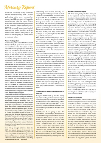 16 Phonebox Magazine | April 2025Mercury ReportIt was an unusually busy chamber for last month%u2019s Olney Town Council gathering, with every councillor present and 22 members of the public shoe-horned into the room. There must have been something important in the air then? There certainly was: BOFF. Olney%u2019s well-known food festival was coming under scrutiny, and we weren%u2019t even sure if it was going to go ahead. It was all going to come down to a closed vote%u2026Public ParticipationSeven of the public present had requested the opportunity to speak in the open forum. And we all knew what the subject of their presentations was going to be. The fi rst of them was Amir Nazary from the Courtyard Brasserie. His objection to BOFF was the length of the festival. From Thursday to Monday the car park is full, he said, and there was also %u2018big damage%u2019 to his business. On each day after the previous night%u2019s BOFF he said he has to clear a lot of rubbish from outside his premises. He felt the businesses that came to the festival were not doing %u2018a proper job%u2019 and that the event brings the %u2018wrong type of people%u2019 into the town.Next to speak was Varges Shturnahalian from Enzo%u2019s Fish Bar. He didn%u2019t like the fact that BOFF has grown from one day (Sunday) into Saturday, too, and now he said his main objection was the Friday, which he felt was %u2018too long%u2019. It aff ects his business, he said, adding that he%u2019s not keen on the amount of alcohol that is %u2018involved%u2019. He has had to put a lock on his gate because he discovered that people have urinated on or near his property. He said a two-day event was suffi cient.In the middle of all this BOFF business, former councillor Jim Cooper popped up to talk about his favourite subject: the allotments, and specifi cally, the use of weedkiller there. He asked the council how many of them owned or worked on an allotment. He didn%u2019t include David Chennells in this question as David is a farmer and has grown a thing or two in his time. Jim wanted to make the point that decisions on the use of weedkiller should be left to the experts at the National Allotment Society. We had, of course, all been here before, and this was one of the reasons for Jim%u2019s rather theatrical resignation from the council a few months back. Councillors around the table should not be making up their own rules about weedkiller, he said. Kevin Viney brought attention back to BOFF and was in favour of the event. He believed misinformation had been put about surrounding BOFF, which had misrepresented the event. This year, he said, the council has set out several conditions for BOFF, including addressing alcohol sales, security, and requiring all committee positions to be fi lled. The BOFF committee have addressed these in good faith. But he added that he believed there was an attempt to undermine the event through a %u2018so-called poll sent to traders but riddled with misleading statements, distortions and outright untruths%u2019. He said the poll was by the Mayor, %u2018someone who should be neutral and impartial%u2019. The Mayor shook her head at this point. Many traders were outraged, he said, making it clear that BOFF is good for their business.Mike Hughes, a former Olney mayor, said he was concerned about the general safety of the Market Place and the event, in particular concerning traffi c and the openness of the market area to traffi c. He asked if the council would consider installing roadblock furniture to seal the road off so that vehicles %u2018can not come through%u2019.Next was Tom Bent from the Pancake Parlour, who said that although his sales were down during the BOFF event, having worked with the committee, they had %u2018thoroughly enjoyed%u2019 the event. He spoke of a letter that had been distributed claiming that traders had not been involved with the event%u2019s committee but said that he and his business had been. He was grateful that he had been part of the event in the past and %u2018not charged%u2019 for that.Jack from Pickles Pet Pantry said he had been a trader in 2023 but not in 2024. He said last year%u2019s event had turned out %u2018quite busy for us%u2019, with visitors buying a treat for their dog, and that the atmosphere was %u2018pretty good%u2019. He asked whether all other Market Place events were going to be reviewed in a similar way to BOFF.Apologies for absence and approval of minutesEveryone had turned up for this clearly important meeting, so there were no apologies, and nobody had any declarations of interest. Deirdre said she wasn%u2019t at the meeting, but she understood that it was said that the council would try to determine what the traders and residents thought about BOFF. Was this done? she asked. Nobody said it was going to be a full consultation, said the Mayor, it was more to do with addressing complaints from residents and traders. That wasn%u2019t how it was reported to me, countered Deirdre, and it%u2019s not in the minutes anyway, about how you would deal with it. I don%u2019t think this is about whether the minutes are correct are not, said Town Clerk Jane Brushwood. This is what we%u2019re dealing with now; in fact, Standing Orders say that by the time it comes to the meeting, the minutes should be considered %u2018as read%u2019. The minutes for last month%u2019s (February) meeting were duly approved.Ward Councillor%u2019s reportCllr Peter Geary had just about managed to find a place to stand at the back of the chambers and was invited to deliver his report. He said a contract had now been issued to the current provider of the MK Connect public transport service. They are changing slightly the way they work, which, he said, we expected. There is now a guarantee of 60 minutes wait maximum for users, although Peter didn%u2019t know how that would be monitored and implemented. It is a two year contract, he said, and there%u2019s an option of a third year.On the New