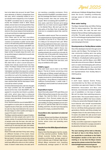 April 2025 | Phonebox Magazine 17April 2025has to be taken into account, he said. There were elements of distinct unhappiness from last year, which outwardly looked to be a successful event enjoyed by a lot of people. The BOFF committee had an action plan to rectify the mistakes made in 2024, David added, and we have no knowing whether they are going to do that. All we know is they have an action plan, and we hope they are going to stick to it. So, do we measure them by last year, or do we trust them to make improvements so that issues don%u2019t happen again?Chris Shaw said he felt that councillors were co-opted onto the council and should %u2018conduct our business in public%u2019 and be seen to do so. He said voting views should be public. He said there will be mistakes with BOFF, but they are a minority. The event has grown, and there%u2019s an argument that it%u2019s too long. But a large number of people enjoy the event, and he would be happy to state that he would vote for it to continue.Deirdre said BOFF doesn%u2019t always get things right, but they will try to make things better. She didn%u2019t like to vote in secret because it implies that nobody would know how they voted. The Mayor interjected there and said that %u2018certain members of the council%u2019 felt %u2018intimidated%u2019, and that%u2019s the reason for a closed vote. She would rather have that than not have councillors turn up for the meeting, she said. You need to be protected from what has been intimidation and bullying from residents of this town, said the Clerk. And for that reason I think it should be voted in private. Christina Diamandopoulos said she thought the major problem was the availability of alcohol all the time. Colin liked BOFF, and he agreed it%u2019s not perfect and there%u2019s a problem with drink, which does lead to antisocial behaviour. Because Olney is Olney, we need to maintain some standards. He was also happy to vote in public.Chris Tennant said the council asked BOFF to put together an action plan to respond to the negative issues of last year, and they did that, he said. So, they have listened to the council. He was happy to vote in public and happy to support the event, he added.The Mayor said she wanted to support traders, residents and also people who work in the nearby vicinity. It%u2019s wonderful that thousands of people come into the town, she said, but it%u2019s what happens afterwards that matters. We voted to go an extra day last year, she added, but my personal opinion was that it was a day too much. David Chennells said that if they were voting on different formats of the event, those formats should have been presented to them. But we haven%u2019t, he said, so we are only voting on whether the event goes ahead. Christina said it was diffi cult to vote on an %u2018all or nothing%u2019 basis. It doesn%u2019t make sense, she said; we%u2019re not reaching a sensible conclusion. Chris Shaw said that if the BOFF committee haven%u2019t got the message that there is some concern moving forward, then they are %u2018pretty silly people%u2019. We%u2019re not dealing with how BOFF run their event, said Chris Tennant; we%u2019re being asked if we, as a town council, support BOFF on the Market Place. We don%u2019t get into the nitty-gritty of the River Fest, he added. But there are no complaints about that, said the Clerk. Councillors voted in secret. Then out came the pre-prepared pieces of photocopied paper for councillors to put the %u2018X%u2019 on. There was a bit of a delay as not everyone had a pen. What few writing implements there were, were duly handed around the table. And the result was read out by the Mayor: eight in favour, two against and one abstention, so BOFF 2025 would go ahead in its current form, she said. At this point, lots of the public left, having heard what they came for. Can you please leave by the right-hand door, said the Clerk above the din. There%u2019s the Bridge Club next door, and they are entitled to their quiet.PCSO%u2019s reportThey went back now to Item 5, the PCSO Report. The list of shame concerning crime in Olney was as follows: assault with injury 4; assault without injury 2; burglary residential 2; burglary business 6; criminal damage 5; drink/drug driving 1; drug off ence 2; harassment 6; malicious communication 1; public order 7; shoplifting 2; theft 3; theft from vehicle 5; theft of vehicle 3.Expenditure reportDavid Chennells asked if OTC paid Olney and Clifton Fishing Club money for the care of the bridges. Yes, said the Clerk, it%u2019s an ancient agreement. Chris Tennant asked why the council was paying rates on the town%u2019s football club building. It%u2019s being reviewed, but we can%u2019t get out of it, said the Clerk. But it%u2019s an empty building, said Chris. You don%u2019t just stop paying because it%u2019s empty, countered the Clerk.Councillors who represent at external meetingsChristina, Richard and the Mayor all attended the North East Area Forum, at the Olney Centre, where crime and speeding were discussed.Results from the SIDs (Speed Indicator Devices)Deputy Clerk Rob Mungham had the results, and they seemed positive. Yardley Road: 20mph (outside Yardley Manor estate, travelling northbound), average speed of 23,314 vehicles was 21.03mph. High Street, 30mph (Maya restaurant end, travelling southbound), average speed of 107,702 vehicles was 19.83mph. Bridge Street, 30mph (near the church, travelling northbound), average speed of 220,104 vehicles was 23.61mph.River water testingThe Mayor thanked Olney and Clifton Fishing Club for being supportive. Two sites were tested by them, she said, the weir near Emberton Park and Olney%u2019s bathing steps down at the Rec. The water quality was acceptable, but %u2018it%u2019s not looking good going ahead%u2019 into the summer, she said. The Environment Agency were being kept informed.Developments on Yardley Manor estateOne of the developers had sent through some results, said the Mayo