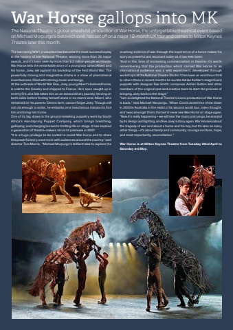 18 Phonebox Magazine | April 2025The National Theatre%u2019s global smash-hit production of War Horse, the unforgettable theatrical event based on Michael Morpurgo%u2019s beloved novel, has set off on a major 18-month UK tour and comes to Milton Keynes Theatre later this month.The harrowing WW1 production has become the most successful play in the history of the National Theatre, winning more than 25 major awards, and it%u2019s been seen by more than 8.3 million people worldwide. War Horse tells the remarkable story of a young boy called Albert and his horse, Joey, set against the backdrop of the First World War. The powerfully moving and imaginative drama is a show of phenomenal inventiveness, fi lled with stirring music and songs.At the outbreak of World War One, Joey, young Albert%u2019s beloved horse, is sold to the Cavalry and shipped to France. He%u2019s soon caught up in enemy fi re, and fate takes him on an extraordinary journey, serving on both sides before fi nding himself alone in no man%u2019s land. Albert, who remained on his parents%u2019 Devon farm, cannot forget Joey. Though still not old enough to enlist, he embarks on a treacherous mission to fi nd him and bring him home.One of its big draws is the ground-breaking puppetry work by South Africa%u2019s Handspring Puppet Company, which brings breathing, galloping, and charging horses to thrilling life on stage. It has inspired a generation of theatre-makers since its premiere in 2007.%u201cIt is a huge privilege to be invited to revisit War Horse and to share this powerful story once more with audiences around the country,%u201d said director Tom Morris. %u201cMichael Morpurgo%u2019s brilliant idea to explore the crushing violence of war through the experience of a horse makes his story as powerful and resonant today as it has ever been. %u201cAnd in this time of increasing commercialism in theatre, it%u2019s worth remembering that the production which carried War Horse to an international audience was a wild experiment, developed through workshops at the National Theatre Studio. It has been an enormous thrill to return there in recent months to reunite Adrian Kohler%u2019s magnifi cent puppets with designer Rae Smith, composer Adrian Sutton and other members of the original cast and creative team to start the process of bringing Joey back to the stage.%u201d%u201cI am so delighted the National Theatre%u2019s iconic production of War Horse is back,%u201d said Michael Morpurgo. %u201cWhen Covid closed the show down in 2020 in Australia in the midst of its second world tour, many thought, and I was amongst them, that we%u2019d never see War Horse on stage again. %u201cNow it%u2019s really happening %u2013 we will hear the music and songs, be amazed by its design and lighting, and live Joey%u2019s story again. War Horse is about the tragedy of war and about a horse and his boy, but it's also so many other things %u2013 it's about family and community, courage and loss, hope, and most importantly, reconciliation.%u201dWar Horse is at Milton Keynes Theatre from Tuesday 22nd April to Saturday 3rd May.War Horse gallops into MK