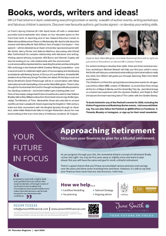 20 Phonebox Magazine | April 2025Books, words, writers and ideas!MK Lit Fest returns in April, celebrating everything bookish or wordy: a wealth of author events, writing workshops and fabulous children%u2019s sessions. Discover new favourite authors, get books signed %u2013 or develop your writing skills.Lit Fest%u2019s Spring Festival (9-12th April) kicks off with a celebrated journalist and broadcaster who draws on four decades spent on the front lines both of reporting and of war. Edward Stourton comes to Waterstones Midsummer Place on Wednesday 9th April to talk about his memoir with StonyWords%u2019 Rob Giff ord. One of today%u2019s %u2018hot topics%u2019 %u2013 free speech %u2013 will be debated by an Open University-sponsored panel with Aki Schilz, Henry Porter and Sabrina Mahfouz discussing with D%u00f3nall Mac Cathmhaoill its complex relationship with literature and writing. Visiting award-winning ecopoets, Will Burns and Hannah Copley will also be looking at our vital relationship with the environment.Local voices will be represented too: awarding the prizes and launching the fi fth anthology in the festival%u2019s MinK Creative Writing Competition %u2013 and a second event to celebrate eight years of encouraging and developing local talents with Raising Voices: A Chorus of Local Writers. Erstwhile MK resident Anna February brings The Hive, her debut YA Fantasy novel, and Stony Stratford%u2019s Sarah Pinborough will be in conversation with fellow international multi-bestselling crime writer Mark Billingham. There%u2019s also thought for food amidst the food for thought as Sanjana Modha presents her dazzling cookbook %u2013 and ticket holders get a tasting plate, too!Fans of less easily categorised fi ction should book a seat to hear Kaliane Bradley talk to Eley Williams about her time travel romcom spy thriller (yes, really), The Ministry of Time. Meanwhile, those who also like to unravel real life can hear Lubaaba Al-Azami exploring the English in 16th century India and their encounters with the Mughal dynasty through an Asian lens, while Hallie Rubenhold talks to Imogen Roberston about her new book looking at the true crime story of infamous murderer, Dr Crippen.For writers looking to develop their skills, there are three exclusive twohour workshops: Michael Stewart will help you fi nd your writer%u2019s voice, Aki Schilz will help you understand what editing is (and what editors really do), while Zoe Gilbert will guide you through Spinning Tales from Myth and Folklore. The Children%u2019s Lit Fest this spring features interactive events for all ages. Laura Henry-Allain MBE, creator of CBeebies%u2019 JoJo and Gran Gran, brings all the fun of Maya & Marley and the Great Big Tidy Up; Jack Noel brings us a brand new superhero with the dynamic Dadbot, and Onjali Q. Ra%u00faf introduces the heart-warming tale of The Letter with the Golden Stamp.To book tickets for any of the Festival%u2019s events for 2025, including the Online Programme and Bookshop Series events, visit www.mklitfest.org. You can also follow the Festival as @MKLitFest on Facebook, X, Threads, Bluesky or Instagram, or sign up for their email newsletter.Onjali Q. Ra%u00faf, Mark Billingham and Hallie Rubenhold (from left to right) are just some of the authors on hand at MK%u2019s Literary Festival