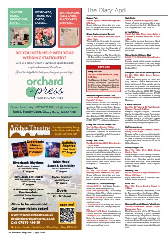 26 Phonebox Magazine | April 2025Bosom PalsTue 1st, Age UK, Peartree Bridge MK6 3EB, 7pmGroup offering friendship and support for people who have experienced breast cancer. AGM and bingo.Olney Archaeological SocietyTue 1st The Olney Centre and Zoom, 10am-12pm%u201cRichard III, the King under the car park: Solving a 500-year old mystery.%u201d %u2013 A talk by Mathew Morris, One of the lead archaeologists from the University of Leicester on the Grey Friars project. Remote lecturer.Visitors welcome at The Olney Centre - %u00a34. Tea, coff ee, biscuits included. For further information, visit www.mkheritage.org.uk/oas.Newport Pagnell Probus ClubTue 1st, Swan Revived Hotel, Newport Pagnell, 12.15pmGroup meets on the fi rst Tuesday of every month for lunch and a variety of speakers. This month: Robert Brewer %u2018The roles of supporting artists, aka Film and TV Extras and how anyone can do it.%u2019 More details or to visit, contact: John Brimley, 01908 605378, johnbrimley37@btinternet.com, Neil Beeton, 01908 914771, neilbeeton@sky.com.Olney and District Flower Club Tue 1st, Olney Centre, 7.30pmGroup hosting a fl oral demonstration by Lee Berrill. There will be a raffl e of the arrangements at the end of the evening. Entry for visitors: %u00a310.Olney Lace CircleWed 2nd, 23rd and 30th Olney Centre 1.30 -3.30pmA group of like minded people who meet on a weekly basis during term time to pursue the art of lacemaking. There is a teacher on hand, so newcomers are always welcome, along with experienced lacemakers who might need assistance from time to time. More details, Sue Mungham 07748 968 552.Bosom PalsFri 4th, Morrisons Community Meeting Room, Westcroft, MK, 2pmGroup offering friendship and support for people who have experienced breast cancer. Social meeting.Yardley Arts, Yardley Hastings.4th April (10-4) - Art Studio Session. More info, www.yardleyarts.org 5th & 26th April (10-4) - Life Drawing - Untutored AM, PM or all day sessions More info, www.yardleyarts.org6th April (10.30-4.30) - Leaded Stained Glass workshop. More info, www.yardleyarts.org12th April (2-4) - Saturday Art Club for Children. More info, www.yardleyarts.org25th April (10.15-2pm) - Introduction to Linocut. More info, www.yardleyarts.org28th April (1-5) - Watercolour Painting. More info, www.yardleyarts.org29th April-3 June (10-12.30) - 6 week Watercolours techniques course. More info, www.yardleyarts.orgThe Diary: April DON%u2019T MISSOlney Jazz ClubTue 1st, Carlton House Club, Olney, 8-10.30pmTad Newton & Jazz Friends The Fenny Stompers. Sponsored by Phonebox Magazine. Tickets %u00a315 from Carlton House Club or Phonebox Magazine.Quiz NightFri 4th, Lavendon Village Hall, 8pmTeams of up to six people. Bring your own refreshments. Entry %u00a33. More info call Margaret on 01234 713870.Art exhibitionFri 4th-Sat 26th , Three Hares Gallery, Cowper & Newton Museum, 11am4.30pmOlney artist Jessica Bergmann Ward presents %u2018Freedom Within Precision%u2019. This new exhibition is free to see. More details: www.cowperandnewtonmuseum.org.uk.Olney Senior Citizens ClubFri 4th, 11th, 18th, 25th, Olney Centre, 2-4pmPopular social club%u2019s regular meetings include in April: Whist/Chat (4th); Bingo (11th); AGM (25th). No meeting on Good Friday (18th).Georgian Dancers of Amazing GraceFri 4th, 11th, 25th, Olney Centre, 7-8.30 pmJoin our friendly group of 18th Century Dancers. Gentle exercise with a historical interest. New people warmly welcome. No partner nor experience necessary. We meet on Friday evenings at The Olney Centre MK46 4EF. Please contact walkerrd@sky.com or 07967 117019 if you are interested in joining us. Affi liated to the Cowper and Newton Museum.Carmina BuranaSat 5th, St Peter & St Paul Church, Newport Pagnell, 7.30 pmNewport Pagnell Singers, Jonathan Harris, the Alina Orchestra Percussion Pianists and more, raising funds for UnityMK. Entry: %u00a312 (child %u00a35).Tickets available from Cambourne Travel. More details: newportpagnellsingers.co.uk. Coff ee mornings Sat 5th and Sat 19th, Baptist Church, Olney, 10-11.30amRegular coff ee mornings at the church. Pop in and enjoy a hot drink and piece of cake in friendly surroundings %u2013 everyone welcome. Donations in aid of Willen Hospice.Olney Bridge ClubMon 7th, 14th, 21st, 28th, Olney Centre, 7pm Olney Bridge Club is a friendly club affi liated to the EBU which plays duplicate bridge every Monday evening apart from Bank Holidays. New members welcome. More details: John Claydon, 01234 713045.Memory Club Fri 7th, Church Hall, High Street South, Olney, 1.30-3pmEnjoy tea/coff ee and a chat with pancakes! All are welcome.Folio TalkMon 7th, Olney Centre Room 4, 7.30pm%u2018Olney Area: History & Mysteries%u2019, a talk by Tom Jones from the Cowper & Newton Museum. Tickets include refreshments: %u00a36 in advance at www.ticketsource.co.uk/folio or 0333 666 3366.Newport Pagnell Women%u2019s InstituteTue 8th, Brooklands. Starts 7.15pm. Doors open 7pm. Monthly meeting of the NP Women%u2019s Institute, featuring a guest speaker demonstrating Bollywood Dancing. Visitors and potential members are welcome. Entry: %u00a35 (cash only). There%u2019s a raffl e and refreshments are served. More details: newportpagnellwi@gmail.com.Presenting an exciting line-up of live theatre and music this August. Don%u2019t mi%u0005 out! www.thearchestheatre.co.uk david@thearchestheatre.co.ukCall 07879 414%u008f 0 The Arches Theatre, Church Farm, Clifton Reynes, Olney MK46 5DTRiverbank Rhythms3rd AugustBenefit concert in support of CentrePoint CharityTruly, Jack The Ripperwith %u2018Don%u2019t Go Into The Cellar%u2019 Theatre CompanyRobin HoodSense & Sensibilitywith DOT ProductionsPeter Rabbit17th Augustwith LOL TheatreDuetsMore to be announced....Get your tickets today!Supersonic Queen(Queen Tribute)1st AugustSupersonic (Queen Tribute)1DefinitelyMightbe(Oasis Tribute)2nd Augustscan me!8th AugustA Midsummer Night%u2019s DreamFrankensteinwith British Touring Shakespeare9th August10th Augustwith The B