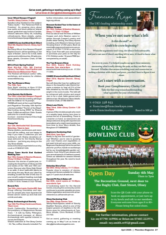April 2025 | Phonebox Magazine 27Got an event, gathering or meeting coming up in May? Let us know at: diary@phoneboxmagazine.comInner Wheel Newport PagnellTue 8th, Olney Centre, 2-4pmSpeaker is Kay Goddard on the subject: %u2018Kalico Quilts %u2013 The Patterned Path to Freedom%u2019. An amazing story about how quilts and block patterns helped slaves guide their way north to Canada. Visitors welcome. Entry %u00a35, including refreshments. More details: Jackie, innerwheelnewportpagnell@gmail.com.CAMEO (Come And Meet Each Other)Wed 9th, Baptist Church, Olney, April 2-4pmRev Steve Wood, from Newport Pagnell Baptist Church, will be speaking on the topic of Easter. Join in for a chat, table games and a delicious tea. All welcome. More details, Christine Chatt, 07786 658767.MK Lit Fest: Spring FestivalWed 9th-Sat 12th, MK Central Library, The Parks Trust Pavilion and Waterstones Midsummer PlaceThe Festival will feature author talks, workshops, and sessions for children. www.mklitfest.org.The Two Brewers OlneyThu 10th, 7pmQuiz Night starting at 8pm 01234 711393 www.twobrewersolney.co.uk.Arts Society North BucksThu 10th, Lovat Hall, Newport PagnellPlease note that the meeting will begin with the AGM at 10.15 prompt.TASNB will meet at the Lovat Hall Newport Pagnell on Thursday 10th April for a lecture entitled %u2018The Art of the Steal%u2013Nazi looting during WW2%u2019 by Shauna Isaac. Coff ee served from 10am. Guests welcome for a small charge.Contact membershipnorthbucks@theartssociety.org.Stamp FairSat 12th, Methodist Hall, Queensway, Bletchley, 10am to 4pmStamp dealers, auctioneers and members will be selling, and are happy to help if you have a collection you are looking to sell. Stamp donations always welcome for the Charity Stamp Auctions %u2013 just bring any along on the day. More details: www.miltonkeynesphilatelicsociety.co.uk or 01908 521220.Olney Town North End Guided Walking TourSun 13th, Cowper & Newton Museum, Olney,10.30am-12.30pmDiscover the stories of yesteryear, including the Great Fires of Olney and life and trades of the 18th and 19th centuries. Discover why Olney High Street is so wide. A short walk with plenty to see along the way. Book your place by emailing us with the title of this tour in your email%u2019s subject heading: events@cowperandnewtonmuseum.org.uk or 01234 711516. Tickets: %u00a312 (U-16 free).Bosom PalsTue 15th, John Lewis, Centre:MK, 2pmGroup offering friendship and support for people who have experienced breast cancer. Catch up and chat over a drink and cake.Olney Archaeological SocietyTue 15th The Olney Centre and Zoom, 10am-noonSouth Caldecotte: Excavations on the periphery of Magiovinium Roman Town. %u2013 A talk by Kathy Pilkington, Archaeological manager at Albion Archaeology with special interest in survey techniques.Visitors welcome at The Olney Centre - %u00a34. Tea, coff ee, biscuits included. For further information, visit www.mkheritage.org.uk/oas.Museum Guided Tour in the home of William CowperSat 19th, Cowper & Newton Museum, Olney, 11.15am-12.30pmFind out about how the lives of William Cowper and John Newton came together through Cowper%u2019s poetry and prolifi c letter-writing, the Olney Hymns including John Newton%u2019s famous hymn %u2018Amazing Grace%u2019 of 250 years, Book via events@cowperandnewtonmuseum.org.uk, or 01234 711516/ or ask in the Shop. Cost: Free with your annual pass or purchase your pass on the day for %u00a310. Children under 16 years FREE (accompanied by an adult).The Two Brewers OlneySun 20th, Easter Bank Holiday Karaoke, 7pm, starts 8pmwww.twobrewersolney.co.uk. 01234 711393.CAMEO (Come And Meet Each Other)Wed 23rd, Baptist Church, Olney, 2-4pmSue will describe how her walking holidays in the beautiful Lake District became a mission to %u2018bag%u2019 all 214 of the fells detailed by the late Alfred Wainwright in his iconic books. The talk will be enhanced with photos and props! Join in for a chat, table games and a delicious tea. All welcome. More details: Christine Chatt, 07786 658767.Olney Lace CircleWed 23rd, 30th Olney Centre 1.30 -3.30pmA group of like minded people who meet on a weekly basis during term time to pursue the art of lacemaking. There is a teacher on hand, so newcomers are always welcome along with experienced lacemakers who might need assistance from time to time. More details; Sue Mungham 07748968552Beginners Gardening ClubWed 23rd, 1pm-2pmReady to dig into the world of gardening? Whether you%u2019re new to growing your own flowers and vegetables or just want to brush up on your skills, our Beginners Gardening Club is the perfect place for you! Fun, hands-on workshops led by our knowledgeable garden volunteers. Cost: Only %u00a32 per session with your annual pass (or %u00a34 without a pass). Check our website for session themes throughout the year. No need to book in advance.Saturday StoryTimeSat 26th, Olney Library, 11-11.30amPopular drop-in session of stories, songs and rhymes suitable for children ages 3-7 years but all welcome.Harrold Pit Run & Bake-off Sat 26th, event opens at 12.30pm, race starts 1pmA fundraising event for the Harrold Centre, ensuring the community centre continues to provide valuable services. Online registration and more info at haroldcentre.co.uk/harrold-pit-run.Olney Gardening ClubTue 29th, Olney Centre, 7pmTalk by Paula Dyason, owner of %u2018Strictly Daylilies%u2019 Nursery, which is one of the largest growers of daylilies in the UK. Doors open for refreshments at 7pm. More details, Chris Richbell, 01234 241700.Got an event, gathering or meeting coming up in May? Let us know at: diary@phoneboxmagazine.com.The UK%u2019s leading relationship coachBased in MK46t: 07931 338 653e: francine@francinekaye.comwww.francinekaye.comFrancine KayeWhen you%u2019re not sure what%u2019s leftWhen the arguments won%u2019t stop, the silence feels unbearable,and you%u2019re not sure if there%u2019s anything left to save, it%u2019s hard to know what to do next.For over 25 years, I%u201