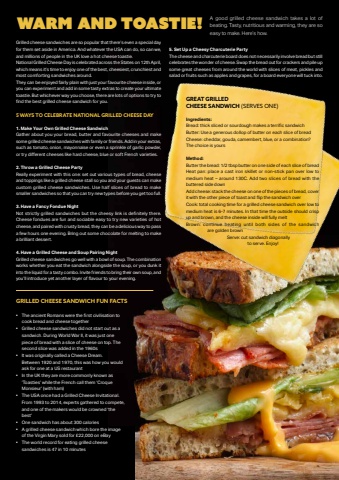 28 Phonebox Magazine | April 2025Grilled cheese sandwiches are so popular that there%u2019s even a special day for them set aside in America. And whatever the USA can do, so can we, and millions of people in the UK love a hot cheese toastie.National Grilled Cheese Day is celebrated across the States on 12th April, which means it%u2019s time to enjoy one of the best, cheesiest, crunchiest and most comforting sandwiches around. They can be enjoyed fairly plain with just your favourite cheese inside, or you can experiment and add in some tasty extras to create your ultimate toastie. But whichever way you choose, there are lots of options to try to fi nd the best grilled cheese sandwich for you.5 WAYS TO CELEBRATE NATIONAL GRILLED CHEESE DAY1. Make Your Own Grilled Cheese SandwichGather about you your bread, butter and favourite cheeses and make some grilled cheese sandwiches with family or friends. Add in your extras, such as tomato, onion, mayonnaise or even a sprinkle of garlic powder, or try diff erent cheeses like hard cheese, blue or soft French varieties.2. Throw a Grilled Cheese PartyReally experiment with this one: set out various types of bread, cheese and toppings like a grilled cheese stall so you and your guests can make custom grilled cheese sandwiches. Use half slices of bread to make smaller sandwiches so that you can try new types before you get too full.3. Have a Fancy Fondue NightNot strictly grilled sandwiches but the cheesy link is defi nitely there. Cheese fondues are fun and sociable easy to try new varieties of hot cheese, and paired with crusty bread, they can be a delicious way to pass a few hours one evening. Bring out some chocolate for melting to make a brilliant dessert.4. Have a Grilled Cheese and Soup Pairing NightGrilled cheese sandwiches go well with a bowl of soup. The combination works whether you eat the sandwich alongside the soup, or you dunk it into the liquid for a tasty combo. Invite friends to bring their own soup, and you%u2019ll introduce yet another layer of fl avour to your evening.A good grilled cheese sandwich takes a lot of beating. Tasty, nutritious and warming, they are so Warm and toastie!easy to make. Here%u2019s how.5. Set Up a Cheesy Charcuterie PartyThe cheese and charcuterie board does not necessarily involve bread but still celebrates the wonder of cheese. Swap the bread out for crackers and pile up some great cheeses from around the world with slices of meat, pickles and salad or fruits such as apples and grapes, for a board everyone will tuck into.GREAT GRILLED CHEESE SANDWICH (SERVES ONE)Ingredients:Bread: thick sliced or sourdough makes a terrifi c sandwichButter: Use a generous dollop of butter on each slice of breadCheese: cheddar, gouda, camembert, blue, or a combination? The choice is yoursMethod:Butter the bread: 1/2 tbsp butter on one side of each slice of breadHeat pan: place a cast iron skillet or non-stick pan over low to medium heat %u2013 around 130C. Add two slices of bread with the buttered side downAdd cheese: stack the cheese on one of the pieces of bread, cover it with the other piece of toast and fl ip the sandwich overCook: total cooking time for a grilled cheese sandwich over low to medium heat is 6-7 minutes. In that time the outside should crisp up and brown, and the cheese inside will fully meltBrown: continue heating until both sides of the sandwich are golden brown Serve: cut sandwich diagonally to serve. Enjoy!GRILLED CHEESE SANDWICH FUN FACTS%u2022 The ancient Romans were the fi rst civilisation to cook bread and cheese together%u2022 Grilled cheese sandwiches did not start out as a sandwich. During World War II, it was just one piece of bread with a slice of cheese on top. The second slice was added in the 1960s%u2022 It was originally called a Cheese Dream. Between 1920 and 1970, this was how you would ask for one at a US restaurant %u2022 In the UK they are more commonly known as %u2018Toasties%u2019 while the French call them %u2018Croque Monsieur%u2019 (with ham)%u2022 The USA once had a Grilled Cheese Invitational. From 1993 to 2014, experts gathered to compete, and one of the makers would be crowned %u2018the best%u2019%u2022 One sandwich has about 300 calories %u2022 A grilled cheese sandwich which bore the image of the Virgin Mary sold for %u00a322,000 on eBay%u2022 The world record for eating grilled cheese sandwiches is 47 in 10 minutes