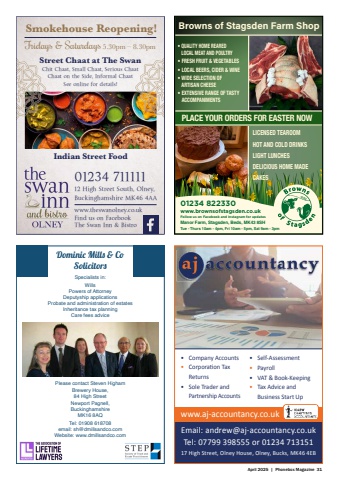 April 2025 | Phonebox Magazine 31%u2022 Company Accounts%u2022 Corporati on Tax Returns%u2022 Sole Trader and Partnership AccountsEmail: andrew@aj-accountancy.co.ukTel: 07799 398555 or 01234 71315117 High Street, Olney House, Olney, Bucks, MK46 4EB%u2022 Self-Assessment%u2022 Payroll%u2022 VAT & Book-Keeping%u2022 Tax Advice and Business Start Upwww.aj-accountancy.co.ukDominic Mills & CoSolicitorsSpecialists in:WillsPowers of AttorneyDeputyship applicationsProbate and administration of estatesInheritance tax planningCare fees advicePlease contact Steven HighamBrewery House, 84 High StreetNewport Pagnell, BuckinghamshireMK16 8AQTel: 01908 618708email: sh@dmillsandco.comWebsite: www.dmillsandco.comwww.brownsofstagsden.co.ukFollow us on Facebook and Instagram for updatesManor Farm, Stagsden, Beds, MK43 8SHTue - Thurs 10am - 4pm, Fri 10am - 5pm, Sat 9am - 3pmLICENSED TEAROOMHOT AND COLD DRINKSLIGHT LUNCHESDELICIOUS HOME MADE CAKES01234 822330Browns of Stagsden Farm Shop %u2022 QUALITY HOME REARED LOCAL MEAT AND POULTRY%u2022 FRESH FRUIT & VEGETABLES %u2022 LOCAL BEERS, CIDER & WINE%u2022 WIDE SELECTION OF ARTISAN CHEESE%u2022 EXTENSIVE RANGE OF TASTY ACCOMPANIMENTS PLACE YOUR ORDERS FOR EASTER NOW12 High Street South, Olney, Buckinghamshire MK46 4AA01234 711111Fridays & Saturdays 5.30pm %u2013 8.30pmStreet Chaat at The SwanChit Chaat, Small Chaat, Serious ChaatChaat on the Side, Informal ChaatSee online for details! Smokehouse Reopening!www.theswanolney.co.ukFind us on FacebookThe Swan Inn & BistroIndian Street Food