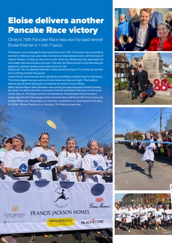 32 Phonebox Magazine | April 2025Eloise delivers another Pancake Race victoryOlney%u2019s 76th Pancake Race was won by past winner Eloise Kramer in 1 min 7 secs.The historic race is thought to have been fi rst run in 1445. The event in its current form started in 1948 and, two years later, it became an international event, with the town of Liberal, Kansas, running its own race on the same day. Eloise won two years ago but was beaten into second place last year. This year, the Olney winner%u2019s race time was just pipped by Liberal%u2019s fastest runner, with a time of 1.03.Eloise said: %u2018Yes, I%u2019m pleased with that. I really wanted to enjoy it. It%u2019s a lovely day and the sun is shining and that was good.%u2019 Linda Church came second, with Lupa Morera and Rebecca Budd tying for third place. The three-legged race was won by Emma Clarke and Stacey Knight. The tradition follows that all those taking part are women who work or live in Olney. Milton Keynes Mayor Marie Bradburn was among the special guests invited to watch the races. As well as the main race event, local schoolchildren take part in mini-races on the day, too. The Mayor joined Lord Lieutenant of Buckinghamshire Countess Howe, High Sheriff of Buckinghamshire Kurshida Mirza, MK North MP Chris Curtis and Debbie Whitworth, Olney Mayor, to cheer the competitors on. Save space in the diary for 2026 %u2013 Shrove Tuesday is on Tuesday, 17th February next year.
