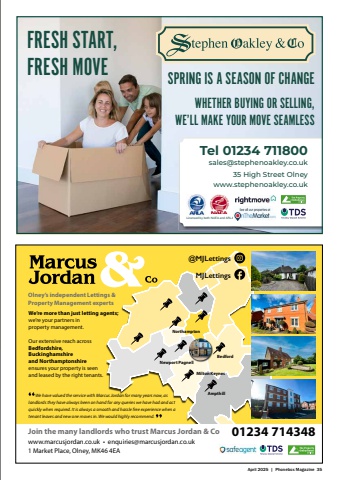 April 2025 | Phonebox Magazine 35MJLettings@MJLettingsOlney%u2019s independent Lettings & Property Management expertsWe%u2019re more than just letting agents;we%u2019re your partners in property management. Our extensive reach across Bedfordshire, Buckinghamshire and Northamptonshireensures your property is seen and leased by the right tenants. We have valued the service with Marcus Jordan for many years now, as landlords they have always been on hand for any queries we have had and act quickly when required. It is always a smooth and hassle free experience when a tenant leaves and new one moves in. We would highly recommend.NorthamptonNewport PagnellMilton KeynesAmpthillBedfordJoin the many landlords who trust Marcus Jordan & Co 01234 714348www.marcusjordan.co.uk %u2022 enquiries@marcusjordan.co.uk1 Market Place, Olney, MK46 4EALicensed by both NAEA and ARLATel 01234 711800sales@stephenoakley.co.uk35 High Street Olneywww.stephenoakley.co.ukSPRING IS A SEASON OF CHANGEWHETHER BUYING OR SELLING, WE%u2019LL MAKE YOUR MOVE SEAMLESSFRESH START, FRESH MOVE