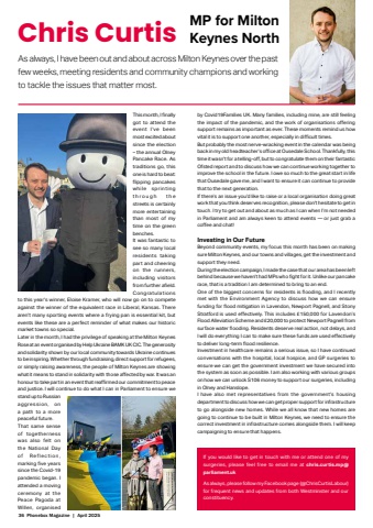 36 Phonebox Magazine | April 2025As always, I have been out and about across Milton Keynes over the past few weeks, meeting residents and community champions and working to tackle the issues that matter most.This month, I fi nally got to attend the event I%u2019ve been most excited about since the election %u2013 the annual Olney Pancake Race. As traditions go, this one is hard to beat: flipping pancakes while sprinting t h r o u g h t h e streets is certainly more entertaining than most of my time on the green benches. It was fantastic to see so many local residents taking part and cheering on the runners, including visitors from further afi eld. Congratulations to this year%u2019s winner, Eloise Kramer, who will now go on to compete against the winner of the equivalent race in Liberal, Kansas. There aren%u2019t many sporting events where a frying pan is essential kit, but events like these are a perfect reminder of what makes our historic market towns so special.Later in the month, I had the privilege of speaking at the Milton Keynes Rose at an event organised by Help Ukraine BAMK UK CIC. The generosity and solidarity shown by our local community towards Ukraine continues to be inspiring. Whether through fundraising, direct support for refugees, or simply raising awareness, the people of Milton Keynes are showing what it means to stand in solidarity with those aff ected by war. It was an honour to take part in an event that reaffi rmed our commitment to peace and justice. I will continue to do what I can in Parliament to ensure we stand up to Russian aggression, on a path to a more peaceful future. That same sense of togetherness was also felt on the National Day o f Re f l e c t i o n , marking fi ve years since the Covid-19 pandemic began. I attended a moving ceremony at the Peace Pagoda at Willen, organised Chris Curtis MP for MiltonKeynes Northby Covid19Families UK. Many families, including mine, are still feeling the impact of the pandemic, and the work of organisations off ering support remains as important as ever. These moments remind us how vital it is to support one another, especially in diffi cult times.But probably the most nerve-wracking event in the calendar was being back in my old headteacher%u2019s offi ce at Ousedale School. Thankfully, this time it wasn%u2019t for a telling-off , but to congratulate them on their fantastic Ofsted report and to discuss how we can continue working together to improve the school in the future. I owe so much to the great start in life that Ousedale gave me, and I want to ensure it can continue to provide that to the next generation. If there%u2019s an issue you%u2019d like to raise or a local organisation doing great work that you think deserves recognition, please don%u2019t hesitate to get in touch. I try to get out and about as much as I can when I%u2019m not needed in Parliament and am always keen to attend events %u2014 or just grab a coff ee and chat!Investing in Our Future Beyond community events, my focus this month has been on making sure Milton Keynes, and our towns and villages, get the investment and support they need.During the election campaign, I made the case that our area has been left behind because we haven%u2019t had MPs who fi ght for it. Unlike our pancake race, that is a tradition I am determined to bring to an end.One of the biggest concerns for residents is fl ooding, and I recently met with the Environment Agency to discuss how we can ensure funding for fl ood mitigation in Lavendon, Newport Pagnell, and Stony Stratford is used eff ectively. This includes %u00a3150,000 for Lavendon%u2019s Flood Alleviation Scheme and %u00a320,000 to protect Newport Pagnell from surface water fl ooding. Residents deserve real action, not delays, and I will do everything I can to make sure these funds are used eff ectively to deliver long-term fl ood resilience.Investment in healthcare remains a serious issue, so I have continued conversations with the hospital, local hospice, and GP surgeries to ensure we can get the government investment we have secured into the system as soon as possible. I am also working with various groups on how we can unlock S106 money to support our surgeries, including in Olney and Hanslope.I have also met representatives from the government%u2019s housing department to discuss how we can get proper support for infrastructure to go alongside new homes. While we all know that new homes are going to continue to be built in Milton Keynes, we need to ensure the correct investment in infrastructure comes alongside them. I will keep campaigning to ensure that happens.If you would like to get in touch with me or attend one of my surgeries, please feel free to email me at chris.curtis.mp@parliament.ukAs always, please follow my Facebook page (@ChrisCurtisLabour) for frequent news and updates from both Westminster and our constituency.