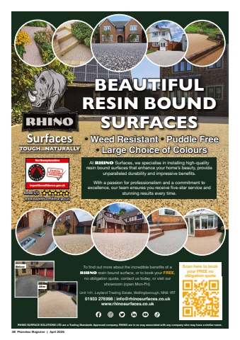 38 Phonebox Magazine | April 2025BEAUTIFUL RESIN BOUNDSURFACESRHINO SURFACE SOLUTIONS LTD are a Trading Standards Approved company. RHINO are in no way associated with any company who may have a similar name.To find out more about the incredible benefits of a Rhino resin bound surface, or to book your FREE, no obligation quote, contact us today, or visit our showroom (open Mon-Fri).Unit 141, Leyland Trading Estate, Wellingborough, NN8 1RT 01933 276998 | info@rhinosurfaces.co.uk www.rhinosurfaces.co.ukScan here to book your FREE no obligation quoteRated 5/5www.buywithconfidence.gov.ukAt Rhino Surfaces, we specialise in installing high-quality resin bound surfaces that enhance your home%u2019s beauty, provide unparalleled durability and impressive benefits. With a passion for professionalism and a commitment to excellence, our team ensures you receive five-star service and stunning results every time.%u2022 Weed Resistant %u2022 Puddle Free %u2022 Large Choice of ColoursBeforeAfter