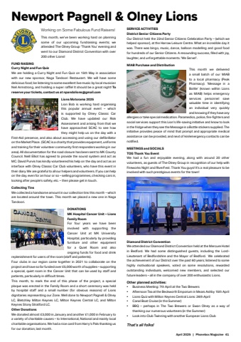April 2025 | Phonebox Magazine 41Working on Some Fabulous Fund Raisers!This month, we%u2019ve been working hard on planning some of our upcoming fundraising events; we attended The Olney Group %u2018Thank You%u2019 evening and went to our Diamond District Convention with over 200 other Lions!FUND RAISING Curry Night and Fun QuizWe are holding a Curry Night and Fun Quiz on 15th May in association with our new sponsor, Naga Tandoori Restaurant. We will have some delicious food; be listening to some excellent live music by local musician Neil Armstrong, and holding a super raffl e! It should be a great night! To reserve your tickets, contact us at npandolions@gmail.comLions Motorama 2025Lion Bob is working hard organising this popular annual event %u2013 which is supported by Olney Classic Car Club. We have updated our Risk Assessment and arising from that we have approached SCAC to see how they might help us on the day with a First-Aid presence, and also about accessing and using our defi brillator on the Market Place. (SCAC is a charity that provides equipment, uniforms and training for their volunteer community fi rst responders working in our area). All documentation for the road closure has been sent to MK County Council. Neill Elliot has agreed to provide the sound system and act as MC. David Purvis has kindly volunteered his help on the day and act as an interface with Olney Classic Car Club volunteers, who have this event in their diary. We are grateful to all our helpers and volunteers. If you can help on the day, even for an hour or so %u2013 selling programmes, checking cars in, looking after people%u2019s safety, etc. %u2013 then please get in touch.Collecting TinsWe collected a handsome amount in our collection tins this month %u2013 which are located around the town. This month we placed a new one in Naga Tandoori.DONATIONS MK Hospital Cancer Unit %u2013 Lions Family RoomFor four years we have been involved with supporting the Cancer Unit at MK University Hospital, particularly by providing furniture and other equipment for a Quiet Room and also ongoing funds for food and drink replenishment for users of the room (staff and patients). Four clubs in our region came together in 2021 to collaborate on the project and have so far funded over %u00a35,000 worth of supplies %u2013 supporting a special, quiet room in the Cancer Unit that can be used by staff and patients, particularly in diffi cult times. This month, to mark the end of this phase of the project, a special plaque was erected in the Family Room and a short ceremony was held by hospital staff and a small number (for obvious reasons) of Lions dignitaries representing our Zone. Well done to Newport Pagnell & Olney LC, Bletchley Milton Keynes LC, Milton Keynes Central LC, and Milton Keynes Stony Stratford LC.Other DonationsWe donated almost %u00a33,000 in January and another %u00a31,000 in February to a variety of charitable causes %u2013 to International, National and mainly local charitable organisations. We had a nice card from Harry%u2019s Pals thanking us for our donation, last month.Newport Pagnell & Olney LionsSERVICE ACTIVITIESDistrict Senior Citizens PartyOur District held the 22nd Senior Citizens Celebration Party %u2013 (which we helped sponsor), at the Harrow Leisure Centre. What an incredible day it was. There was bingo, music, dance, balloon modelling and good food for hundreds of our Senior Citizens. A resounding success, fi lled with joy, laughter, and unforgettable moments. %u2018We Serve!%u2019.MIAB Purchase and DistributionThis month we delivered a small batch of our MIAB to a local pharmacy (Peak Pharmacy). %u2018Message in a Bottle%u2019 (known within Lions as MIAB) helps emergency services personnel save valuable time in identifying an individual very quickly and knowing if they have any allergies or take special medication. Paramedics, police, fi re-fi ghters and social services support this Lion%u2019s life-saving initiative and know to look in the fridge when they see the Message in a Bottle stickers supplied. The initiative provides peace of mind that prompt and appropriate medical assistance can be provided, and next of kin/emergency contacts can be notifi ed.MEETINGS and SOCIALSTOG Thank You EventWe had a fun and enjoyable evening, along with around 20 other volunteers, as guests of The Olney Group in recognition of our help with Fireworks Night and RiverFest. Thank You guys! It%u2019s a real pleasure to be involved with such prestigious events for the town!Diamond District ConventionWe attended our Diamond District Convention held at the Mercure Hotel in Bedford. We had some distinguished guests, including the LordLieutenant of Bedfordshire and the Mayor of Bedford. We celebrated the achievement of our District over the past 60 years; listened to some highly motivational speakers, voted on some resolutions, rewarded outstanding individuals, welcomed new members, and selected our future leaders %u2013 all in the company of over 200 enthusiastic Lions.Other planned activities:%u2022 Business Meeting: 7th April at the Two Brewers%u2022 Afternoon Tea at the Beckworth Emporium in Mears Ashby 15th April%u2022 Lions Quiz with Milton Keynes Central Lions: 26th April%u2022 Canal Boat Cruise (in the Summer) %u2022 BBQ %u2013 perhaps in The Two Brewers or Swan Olney as a way of thanking our numerous volunteers (in the Summer)%u2022 Look into Club Twinning with another European Lions ClubThat%u2019s all folks!