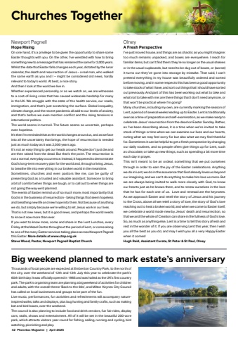 42 Phonebox Magazine | April 2025Newport PagnellHope RisingOn one hand, it%u2019s a privilege to be given the opportunity to share some Easter thoughts with you. On the other, I%u2019ve wrestled with how to bring something new to a message that has remained the same for 2,000 years. Whilst the date that Easter falls changes each year, dictated by the lunar calendar, the death and resurrection of Jesus %u2013 a real man, who walked the same earth as you and I %u2013 might be considered old news, hardly relevant to today%u2019s world. At best, a nice story.And then I look at the world we live in.Whether experienced personally, or as we watch on, we are witnesses to a cost-of-living crisis that has caused widescale hardship for many in the UK. We struggle with the state of the health service, our roads, immigration, and that%u2019s just scratching the surface. Global inequality, climate change, and the recent pandemic all add to our levels of anxiety, and that%u2019s before we even mention confl ict and the rising tensions in international politics.The world seems in turmoil. The future seems so uncertain, perhaps even hopeless.It%u2019s then I%u2019m reminded that as the world changes around us, and as we face into all the uncertainty that brings, the hope of resurrection is needed just as much today as it was 2,000 years ago.It%u2019s not an easy thing to get our heads around. People don%u2019t just die and are then raised from the dead. But that%u2019s the point. The resurrection is not a normal, everyday occurrence. Instead, it happened to demonstrate God%u2019s long-term recovery plan for the world and, through a living Jesus, to breathe life into everything in our broken world in the meantime.Sometimes, churches and even pastors like me, can be guilty of presenting God as a trusted and valuable assistant. Someone to bring a bit of comfort when things are tough, or to call out to when things are not going the way we%u2019d planned.The events of Easter remind us of so much more, most importantly that God is in the business of resurrection - taking things that seem hopeless and breathing new life and new hope into them. Not because of anything we do, but simply because we%u2019re willing to let Jesus work in our lives.That is not new news, but it is good news, and perhaps the world needs to know it now more than ever. If you want to know more, come and share in the Lent Lunches, every Friday at the Mead Centre throughout the period of Lent, or come along to one of the many Easter services taking place across Newport Pagnell this Easter. More details at www.ctnp.org.ukSteve Wood, Pastor, Newport Pagnell Baptist ChurchOlneyA Fresh PerspectiveI%u2019ve just moved house, and things are as chaotic as you might imagine: too much remains unpacked, and boxes are everywhere. I reach for familiar items, but can%u2019t fi nd them: they%u2019re no longer on the usual shelves or in the usual cupboards, but need to be dug out of boxes, or (worse) it turns out they%u2019ve gone into storage by mistake. That said, I can%u2019t pretend everything in my house was beautifully ordered and sorted before moving, and in some respects this has been a good opportunity to take stock of what I have, and sort out things that I should have sorted out previously. And part of this has been working out what to take and what not to take with me: are there things that I don%u2019t need anymore, or that won%u2019t be practical where I%u2019m going?Many churches, including my own, are currently marking the season of Lent, a period of several weeks leading up to Easter. Lent is traditionally seen as a time of preparation and self-examination, as we make ready to celebrate Jesus%u2019 resurrection from the dead on Easter Sunday. Rather, as I%u2019ve been describing above, it is a time when we%u2019re invited to take stock of things: a time when we can examine our lives and our hearts, noting what we may feel sorry for but also what we may feel thankful for. Sometimes it can be helpful to get a fresh perspective by changing our daily routines, and so people often give things up for Lent, such as chocolate, or take up new things, such as spending a bit more time each day in prayer.This isn%u2019t meant to be an ordeal, something that we put ourselves through in order to earn the joy of the Easter celebrations. Anything we do in Lent, we do in the assurance that God already loves us beyond our imagining, and we can%u2019t do anything to make him love us more. But we are always being invited to walk more closely with God, to know our hearts just as he knows them, and to renew ourselves in the love that he has for each one of us. Love and renewal are the keynotes. As we approach Easter and retell the story of Jesus and his journey to the Cross, above all we retell a story of love, the story of God%u2019s love reaching out to heal a broken world; and when we come to Easter itself, we celebrate a world made new by Jesus%u2019 death and resurrection, so that we and the whole of Creation can share in the fullness of God%u2019s love. So, as much as anything else, Lent is a time to tell this story afresh and rest in the wonder of it. If you are observing Lent this year, then I wish you all the best as you do; and may I wish you all a very Happy Easter when it comes!Hugh Reid, Assistant Curate, St Peter & St Paul, OlneyChurches TogetherBig weekend planned to mark estate%u2019s anniversaryThousands of local people are expected at Emberton Country Park, to the north of the city, over the weekend of 12th and 13th July this year to celebrate the park%u2019s 60th birthday. It was offi cially opened in 1965 and was hailed as the UK%u2019s fi rst country park. The park%u2019s organising team are planning a big weekend of activities for children and adults, with the overall theme %u2018Back to the 60s%u2019, and Milton Keynes City Council has called on local businesses and groups to be part of the fun.Live music, performances, fun activities an