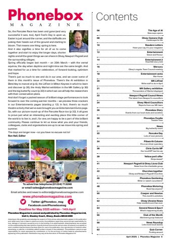 April 2025 | Phonebox Magazine 5ContentsPhonebox Magazine is owned and published by Phonebox Magazine Ltd, Unit 2, Stanley Court, Olney, Bucks MK46 5NHAdvertisers: We gratefully acknowledge the support of firms whose advertisements appear in this publication and, whilst every care is taken to ensure accuracy, the publishers regret they cannot accept responsibility for loss, damage or omission caused by error in the printing of an advertisement. Advertisements are accepted on the understanding that descriptions of goods and services are fair and accurate. All artwork is accepted on strict condition that permission has been given for use in this publication. Any reproduction of material, either advertising or editorial, is forbidden without written consent of the publishers. The publishers cannot accept responsibility for views expressed by contributors, or for the accuracy of claims made by advertisements appearing in this publication. Distribution may vary at the discretion of Phonebox Magazine Ltd.To advertise telephone (01234) 713298or email sales@phoneboxmagazine.comEmail articles and news to editorial@phoneboxmagazine.comwww.phoneboxmagazine.comTwitter: @Phonebox_magFacebook.com/PhoneboxmagDeadline for May 2025 edition - 14th April06 The Age of AI New expo opens08 Olney Camera Club Landscape for life 10 Readers LettersHave your say, it%u2019s your magazine 12 Entertainment Grace and Favour 14 Entertainment 2Heartfelt story told 16 Mercury Olney%u2019s regular Town Council meeting 18 Entertainment extra War Horse 20 MK LitFest Write stuff to do in April 21 MK Gallery exhibition The wonders of Warhol displayed 22 Newport Pagnell Council NewsThe latest from Newport%u2019s councillors 24 Olney Ward CouncillorsReports from our MK team 26 Phonebox Diary Events from our local clubs and societies28 Phonebox Foodie Toastie Time30 News Big butterfl y count 32 Pancake Day Lots of race pictures 34 Pibworth ColumnIt%u2019s a car driver quandary36 Chris Curtis MP Our local MP has his say39 Yellow peril off er Strips tease? 41 Newport Pagnell & Olney Lions ClubNews from the charitable group42 Churches together Olney and Newport Pagnell Churches 45 Phonebox Gardening Bitter or sweet cucumbers? 48 Phonebox MotoringRoad trip anyone?50 Cowper and Newton This month%u2019s activities 52 Olney Ukraine News Help needed more than ever54 General News & SportWhat%u2019s happening locally 55 Club of the Month Allotment group featured56 News Roundup Lots more local stories 62 Quiz Corner Fooling aroundSo, the Pancake Race has been and gone (and very successful it was, too), April Fool%u2019s Day is upon us, Easter is just around the corner, and the daff odils are poking their heads out of the ground and starting to bloom. That means one thing: spring is here.And it also signifi es a time for all of us to come together and start to enjoy the longer days, shorter nights and all the great things we can share in Olney, Newport Pagnell and the surrounding villages. Spring offi cially began last month %u2013 on 20th March %u2013 with the vernal equinox, the day when daytime and night-time are the same length. And that marked for us a time for celebration, of forward-looking, optimism and hope.There%u2019s just so much to see and do in our area, and we cover some of them in this month%u2019s issue of Phonebox. There%u2019s the AI exhibition in Bletchley to marvel at (p 6), the LitFest in Milton Keynes in which to learn and discover (p 20), the Andy Warhol exhibition in the MK Gallery (p 30) and the big butterfl y count (p 30) in which we can all help the researchers with their conservation plans.And don%u2019t forget a packed season of brilliant stage performances to look forward to over the coming warmer months %u2013 we preview three crackers in our Entertainments pages (starting p 12). In fact, there%u2019s so much theatre activity that we%u2019ve even brought you an Entertainment Extra page.So, with our picture round-up of the Pancake Race too (p 32), it all goes to prove just what an interesting and exciting place this little corner of the world is to live in, and I, for one, am happy to be a part of this brilliant community. Please continue to let us know what you and your friends, colleagues, clubs and organisations are up to as we move into spring and summer.The days are longer now %u2013 so you have no excuse not to!Ron Hall, Editor