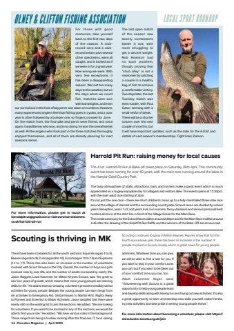 54 Phonebox Magazine | April 2025OLNEY & CLIFTON FISHING ASSOCIATIONFor those with good memories, take yourself back to the fi rst two days of the season. A clubrecord carp and a clubrecord bream, plus several other specimens, were all caught, and it looked as if we were in for a great year. How wrong we were. With very few exceptions, it has been a disappointing season. We lost too many days to the weather, but on the days when we could fish, matches were won with low weights, and even our normal ace in the hole of big perch was down on numbers. However, many experienced anglers feel that fi shing goes in cycles, and a poor year is often followed by a bumper one, so fi ngers crossed for June. On the match front, the fi nal pike and perch were fi shed, and once again, it was Barney who won, and in so doing, he won the overall series as well. All the anglers who took part in the three matches thoroughly enjoyed themselves, and all of them are already planning for next season%u2019s series.LOCAL SPORT ROUNDUPThe last open match of the season saw twenty contestants battle it out, with most struggling to get a decent weight. Rob Hewison had no such problem, though, proving that %u201cchub alley%u201d is not a misnomer by catching a couple in a healthy bag of fi sh to achieve a comfortable victory. Two days later, the last Tuesday match was even harder, with Paul Caton winning with a small netful of bleak.There will be a shorter column over the next couple of months, but it will have important updates, such as the date for the A.G.M. and details of next season%u2019s memberships. Tight lines, Damon.The 41st Harrold Pit Run & Bake-off takes place on Saturday 26th April. This community event has been running for over 40 years, with the main race running around the lakes in the Harrold-Odell Country Park.The busy atmosphere of stalls, attractions, bars, and runners make a great event which is much appreciated as a hugely enjoyable day for villagers and visitors alike. The event opens at 12.30pm, with the main adult race starting at 3pm.It%u2019s not just the one race %u2013 there are short children%u2019s races up to a fully marshalled three-mile race around the village of Harrold and the surrounding countryside. School races are divided by school years: Reception, years 1+2; and years 5+6. Fun runners, fancy-dressers and serious personal best hunters all mix in at the start line in front of the Village Green for the Main Race. The medal ceremony for the School Races will be around 2.30pm and for the Main Race it will be around 4.45 after the drawing of the Great Pit Run Raffl e and the winners of the Bake-Off are announced.Harrold Pit Run: raising money for local causesFor more information, please get in touch at harroldpitrun@gmail.com or visit www.harroldcentre.co.uk/harrold-pit-runScouting is thriving in MK Scouting continues to grow in Milton Keynes. Figures show that for the fourth successive year, there has been an increase in the number of people involved in Scouts locally, which is great news for young people.There have been increases for all the youth sections: Squirrels (ages 4 to 5), Beavers (ages 6 to 8), Cubs (ages 8 to 10), Scouts (ages 10 to 14) and Explorers (14 to 17). There has also been an increase in the number of volunteers involved with Scout Groups in the City. Overall, the number of boys and girls involved rose by over 6%, and the number of adults increased by nearly 3%.Jason Raggett, Lead Volunteer for Milton Keynes Scouts, said %u201cIt%u2019s great to see four years of growth, which means that more young people are learning skills for life.%u201d He added that our amazing volunteers provide incredibly varied activities for young people. Badges the young people can earn range from Air activities to Emergency Aid, Global Issues to Martial Arts. Nights Away to Pioneer and Scientist to Water Activities. Jason detailed that there were nearly 450 on the waiting list to join the sections. He added, %u201cWe are looking for volunteers. If you want to be involved in any of the sections, we would be able to fi nd you a role.%u201d He added, %u201cWe have various roles in the background. These range from being a trustee, looking after the fi nances, IT, fund raising, admin etc. Whatever time you can give, we will be able to fi nd a role for you. If you want to stay in your comfort zone, you can, but If you want to be taken out of your comfort zone, you can, too.Adult volunteer Nigel, said, %u201cVolunteering with Scouts is a great opportunity to help young people learn and develop skills along with having fun and trying out new activities. It%u2019s also a great opportunity to learn and develop new skills yourself, make friends, try new activities and take pride in seeing young people thrive.%u201d For more information about becoming a volunteer, please visit https://www.bucks-scouts.org.uk/join