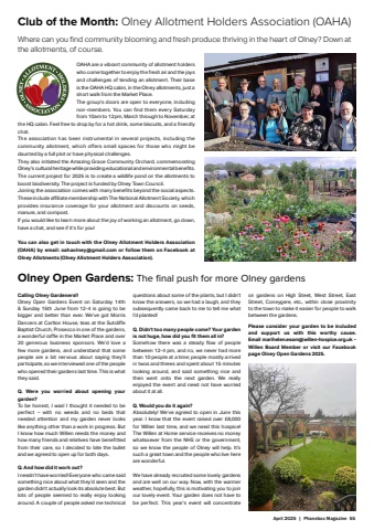 April 2025 | Phonebox Magazine 55Club of the Month: Olney Allotment Holders Association (OAHA)Where can you fi nd community blooming and fresh produce thriving in the heart of Olney? Down at the allotments, of course.OAHA are a vibrant community of allotment holders who come together to enjoy the fresh air and the joys and challenges of tending an allotment. Their base is the OAHA HQ cabin, in the Olney allotments, just a short walk from the Market Place.The group%u2019s doors are open to everyone, including non-members. You can fi nd them every Saturday from 10am to 12pm, March through to November, at the HQ cabin. Feel free to drop by for a hot drink, some biscuits, and a friendly chat.The association has been instrumental in several projects, including the community allotment, which offers small spaces for those who might be daunted by a full plot or have physical challenges.They also initiated the Amazing Grace Community Orchard, commemorating Olney%u2019s cultural heritage while providing educational and environmental benefi ts.The current project for 2025 is to create a wildlife pond on the allotments to boost biodiversity. The project is funded by Olney Town Council.Joining the association comes with many benefi ts beyond the social aspects. These include affi liate membership with The National Allotment Society, which provides insurance coverage for your allotment and discounts on seeds, manure, and compost.If you would like to learn more about the joy of working an allotment, go down, have a chat, and see if it%u2019s for you! You can also get in touch with the Olney Allotment Holders Association (OAHA) by email: oahaolney@gmail.com or follow them on Facebook at Olney Allotments (Olney Allotment Holders Association).Olney Open Gardens: The fi nal push for more Olney gardensCalling Olney Gardeners!!Olney Open Gardens Event on Saturday 14th & Sunday 15th June%u00a0 from 12-4 is going to be bigger and better than ever.%u00a0 We%u2019ve got Morris Dancers at Carlton House, teas at the Sutcliff e Baptist Church, Prosecco in one of the gardens, a wonderful raffl e in the Market Place and over 20 generous business sponsors. We%u2019d love a few more gardens, and understand that some people are a bit nervous about saying they%u2019ll participate, so we interviewed one of the people who opened their gardens last time. This is what they said.Q. Were you worried about opening your garden?To be honest, I was! I thought it needed to be perfect %u2013 with no weeds and no beds that needed attention and my garden never looks like anything other than a work in progress. But I know how much Willen needs the money and how many friends and relatives have benefi tted from their care, so I decided to bite the bullet and we agreed to open up for both days.Q. And how did it work out?I needn%u2019t have worried! Everyone who came said something nice about what they%u2019d seen and the garden didn%u2019t actually look its absolute best. But lots of people seemed to really enjoy looking around. A couple of people asked me technical questions about some of the plants, but I didn%u2019t know the answers, so we had a laugh, and they subsequently came back to me to tell me what I%u2019d planted!%u00a0Q. Didn%u2019t too many people come? Your garden is not huge, how did you fi t them all in?Somehow there was a steady fl ow of people between 12-4 pm, and no, we never had more than 10 people at a time; people%u00a0mostly arrived in twos and threes and spent about 15 minutes looking around, and said something nice and then went onto the next garden. We really enjoyed the event and need not have worried about it at all.Q. Would you do it again?%u00a0Absolutely! We%u2019ve agreed to open in June this year. I know that the event raised over %u00a38,000 for Willen last time, and we need this hospice! The Willen at Home service receives no money whatsoever from the NHS or the government, so we know the people of Olney will help. It%u2019s such a great town and the people who live here are wonderful.We have already recruited some lovely gardens and are well on our way. Now, with the warmer weather, hopefully, this is motivating you to join our lovely event. Your garden does not have to be perfect. This year%u2019s event will concentrate on gardens on High Steet, West Street, East Street, Coneygere, etc., within close proximity to the town to make it easier for people to walk between the gardens.Please consider your garden to be included and support us with this worthy cause. Email%u00a0marihelen.esam@willen-hospice.org.uk%u00a0- Willen Board Member or visit our Facebook page Olney Open Gardens 2025.