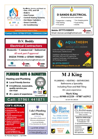 60 Phonebox Magazine | April 2025info@bluefl amemk.co.ukwww.bluefl amemk.co.ukTel: 01908 216769Mob: 07860 332287PLUMBING AND HEATING ENGINEERSBREAKDOWNS AND INSTALLATIONSCONTACT US NOW FOR A QUOTE 33089D.V. BoddyElectrical ContractorsDomestic %u2022 Commercial %u2022 IndustrialAll work part P approved01234 711116 or 07841 196227dvboddyelectricalcontractors@hotmail.comD SANDS ELECTRICALMobile: 07773 930011Email: duncan.sands@hotmail.comAll electrical work undertakenInspection + testingPat testingTV points Car charging pointsFault findingEICRSRegistered no: 927666M: 07776 922517E: contact@aqua-therm.co.ukLocal area engineer covering MK, Northampton, Bedford areas.Installation, Maintenance and Repair on NATURAL GAS and LPG appliancesLandlord Certifi cates, LPG Certifi cates, All Plumbing services%u00ab Local Friendly Service%u00ab A traditional, reasonable, quality service you can trust%u00ab 25 + years of experienceCall: 07961 441871Vulcanhall ltd PLUMBER DAVE & DAUGHTERHeating and PlumbingCentral Heating ServicesCLIMAheat192093KEITH PRYCEM: 07764 577 292T: 01234 241 172E: kpryce@climaheat.co.ukInstallation, maintenance &repairs on all Gas appliances%u25c6 Specialist in Bathroom & Wetroom refurbishments%u25c6 Local and Reliable%u25c6 Free Quotation for all jobsLuke%u2019s Plumbing and Heatinglukesplumbingmk@gmail.comwww.lukesplumbing.co.ukCall 07595 475565COX%u2019S AERIALS%u25cf TV & FM Aerials%u25cf Established 1964%u25cf A professional & high qualityservice%u25cf A quick response to yourindividual needs%u25cf Satellite dish moving & repairs%u25cf Supply & installation offreeview digital boxes%u25cf Multi PointsCall us on T: 01234 822 006M: 07974 933 526E: coxaerials@gmail.com28 Oakley Rd, Bromham, MK43 8HYCall us on T: 01234 822 006M: 07775 985 662E: coxaerials@gmail.com28 Oakley Rd, Bromham, MK43 8HYM J KingPLUMBING ~ HEATING ~ BATHROOMSBathrooms a SpecialityIncluding Floor and Wall Tiling40+ years experienceMark KingSherington 01908 612320 ~ 07887 643912NO VAT ON LABOUR
