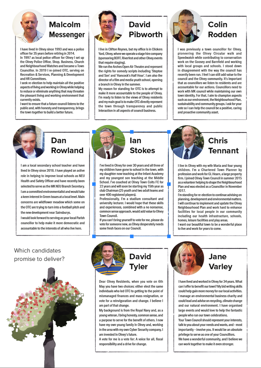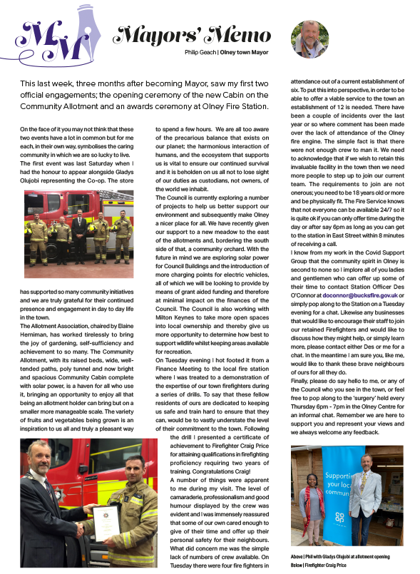 The next meeting will be held on Monday 3rd June at 7pm in the Olney Centre. If you would like to contribute to the Public Participation section at the start of the meeting, or any time the mayor deems appropriate, please contact the Town Clerk, townclerk@olneytowncouncil.gov.uk.