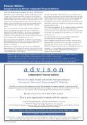 Unlike most IFAs, Advison provide its clients with regular personalised reviews of their investments, enabling us to ensure the assets they hold are still relevant to their circumstances and suitable for their needs. We would be pleased to discuss your specific situation and plan the most appropriate course of action for you. For full details about Advison please see our advert below.