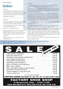 Ladiesleatherankleboots ..................................£19.99 Kneehighstretchboots ....................................£19.99 Sheepskinlinedsympatexleatherboots .......................£29.99 HushPuppiesleatherboots .................................£19.99 Soft leather knee high boots . . . . . . . . . . . . . . . . . . . . . . . . . . . . . . . . .£39.99 Widefittingwarmlinedboots .................................£9.99 Menssoftleatherwarmlinedboots ...........................£29.99 Mens velour slippers . . . . . . . . . . . . . . . . . . . . . . . . . . . . . . . . . . . . . . . .£4.99 Mens and ladies waterproof leather hikers . . . . . . . . . . . . . . . . . . . . . .£24.99 Softleathercasualsandcourts ...............................£9.99 Fashionwedgesinchocolatesuede ..........................£14.99 Trouser shoes from . . . . . . . . . . . . . . . . . . . . . . . . . . . . . . . . . . . . . . . . .£9.99