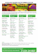 Olney Youth Club Friday 30th August Mini Strikers 1 1 .30am - 1 2.30pm Thursday 1 5th August Thursday 22nd August Olney Youth Club 1 1 .30am - 1 2.30pm WOODLANDS CHILDREN CENTRE SUMMER ACTIVITIES The children centre focuses on children aged between 0-5 years of age but we welcome whole families over the holidays, this means that there will be some activities for older children at our sessions, we ask that older children are mindful of the little ones during the session and help keep them safe. Week Commencing 5th August Week Commencing 1 2th August Week Commencing 1 9th August Week Commencing 1 9th August Monday 5th August Monday 12th August Monday 1 9th August IMonday 26th August BANK HOLIDAY - Children Centre Closed Children Centre Closed Drop In Stay and Play/Soft Play 10.00am - 3.00pm Drop In Stay and Play/Soft Play 10.00am - 3.00pm Tuesday 6th August Tuesday 27th August Ragdolly Anna's Olney Youth Club Ragdolly Anna's Olney Youth Club 1 0.00am - 1 1 .00am and 1 1 .00am - 1 2.00 noon Castlethorpe Village Hall Castlethorpe Village Hall Wednesday 7th August 3.00pm - 4.00pm Tuesday 20th August 11 .00am - 12.00 noon Campbell Park Amphitheatre 1 1 .00am - 4.00pm Tuesday 1 3th August Ragdolly Anna's Olney Youth Club 10.00am - 11 .00am and 1 1 .00am - 12.00 noon Wednesday 28th August Milton Keynes Play Day Ragdolly Anna's Olney Youth Club 1 0.00am - 1 1 .00am and 1 1 .00am - 1 2.00 noon Hanslope Primary School 9.30am - 1 1 .30am Thursday 8th August Very Messy Play! Children Centre Closed Friday 9th August Wednesday 1 4th August Wednesday 21 st August Thursday 29th August Splatter Cats 'not just a box!' Olney Youth Club 1 .00pm - 3.00pm Booking Required Family Suppo Sessions Booking Required Mini Strikers Toddler Time 3.00pm - 4.00pm Hanslope Primary School 9.30am - 1 1 .30am Hanslope Primary School 9.30am - 1 1 .30am Booking Required Very Messy Play! Very Messy Play! Family Support Sessions Family Support Sessions Friday 23rd August Friday 1 6th August Olney Youth Club Splatter Cats, Construction Site Warning 'Kids at Play' Mini Strikers Olney Youth Club 1 0.00am - 1 2 .00 noon 1 1 .30am - 1 2.30pm Olney Youth Club, East Street, Olney, MK46 4DH (next to the fire station) Woodlands Children Centre Hanslope , Long Street, Hanslope M K 1 9 7BL (Children Venues Centre is attached to the right handside of Hanslope Primary School playground, access through side gate) www.milton-keynes.gov.uk/woodlandscc Castlethorpe Village Hall, North Street, Castlethorpe MK19 7EW woodlands.childrenscentre@milton-keynes.gov.uk Toddler Time 1 0.00am - 1 1 .00am and Olney Youth Club Mini Strikers 1 1 .30am - 1 2.30pm 01234 241837 Phonebox Magazine 41