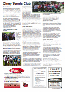 Olney Tennis Club Murray Mania! After Andy's triumph, we have had loads of enquiries and new members. So come and play yourselves, whatever your age or ability as you will be very welcome at Olney Tennis Club. Just contact Anne on 01 234 711936. There are also membership forms and loads of information on olneytennis.net. Sign up for our Summer Camps! Our popular camps run throughout the School Holidays to the end of August. They are run on Thursdays and Fridays with AM and PM sessions. There are groups for 5 year olds up to 16. They are run by qualified coaches and lots of fun. These sessions sell out so book soon. Call Nigel on 07946734377 and see details at www.olneytennis.net. Visit to Wimbledon by Olney Adult Team results The Bucks team are in 3rd place in their league. They lost against a strong Wolverton side despite the efforts of Chris Wright, Gun Chui Hwang, Ian Dunkley, Phil Bennett, Sam Mailman and Stephen Bateson. However they beat Princes Risborough thanks to Phil Anderson, Simon Barter, Chris and Gun and Phil Bennett and Andrew Barr, then had their best result against previously unbeaten Penn and Tyler Green with Gun and Simon, Ian and Stephen and great performances by Juniors Charlie Boatman and Daniel Cornwall. The Mens A have struggled this season, unable to put out their strongest sides but picked up 3 out of 4 points in their last 2 matches. Stephen Bateson, Phil Anderson, Chris Wright and Phil Bennett secured a draw with Leighton Buzzard then Nigel Willard and Gavin Fowell won 8·0 with Juniors Charlie and Stephen. The Mens B are leading their division. The latest win was a 8-0 victory against Wolverton thanks to Fraser Chamberlain, Simon Barter, Dan Avenall and Stephen Bateson. The Mens C is in third place with a chance of promotion. In their last match they beat Open University. The team was Ross Urqhuart, Ted Barnes, Stua Ayling and Malcom Donne. The Ladies B are finding it tough this season in a higher league. They lost against Open University despite a long match and efforts • Woodwork & Ironmongery Installation of wood-floors/ skirtings and architraves; Internal & External door hanging and fitment of locks. • Plumbing & Drainage Installation of bathroom suites/washing machines/dishwashers and outside taps. Juniors ranking events. They were given a guided tour of the show courts, player rooms and watched some great play. We hope there will be an Olney Junior competing there soon! Wimbledon American Tournament A fun event sponsored by the Jardine Motors Group was held in lovely weather and we were pleased to have more Rusty Racket players entering and enjoying themselves. , Wic Just some of the services we can provide: one of their top small clubs with over 80 competing in Our coaches took six Olney juniors to the second week by invitation by the LTA 32 players took part and there was demand for another court. Strawberries and Cream were enjoyed between games and Beryl Rook won the service competition. The final was won by Phil Anderson and Lynn Quennell against by Sarah Wilkinson, Beryl Rook, Anne Bacon and Lynda Baker. In contrast, the Ladies C is leading their division with a 100% record. In their last match they won 8-0 v Newport Pagnell thanks to Ruth Ayling, Jo Bedward, Jo Weatherill and Jo Walker. The Mixed A is in mid table after a big win against David Lloyd as Nigel Willard, Eleanor Carter, Gill Hogston and Gavin Fowell played well. The Mixed B is top of their division after toppling previous leaders Silve rstone in a close match. It was great performance by Dan Avenall, Stephen Bateson, Lynda Baker and Sarah Wilkinson. The Mixed C is having a tough time but is giving players the chance to play team tennis. They lost against Great Linford with Olney's players being Alistair White, Stuart Ayling, Jo Weatherill and Jo Bedward. Junior Team results Our Juniors continue to do wel l in the local leagues. The Under 9A is winning their league and beat Wolverton in the last match thanks to Alex Eglinton, Jake Sargeant and Braedon MacGregor. The U10 team is winning their league. The U12 Boys are second after being beaten by a strong MK side despite brave efforts by Timothy Ball and Jacob Parsons.The same happened to the U16 Boys despite good play by Josh Eglinton and Matthew Balambra. We are also in the tennisMK cup finals for U9, U10 and the U16 girl's final is an all Olney match. National Mini Tennis Week We ran avery successful National Mini Tennis week where Nigel coached all year 1 's & 2's at Olney infants. We had 72 children attending our open day which was a great response. A mega thanks to Liz and Emma for running the event. Olney Building & Maintenance Services Y WHITING Tel 01234 712007 Mobile 07831 337940 QUALI WORKMANSHIP GUARANTEED Simon Barter and Jane Anderson. Sophie Isherwood also won a prize for Promising debutante. The sponsorfrom VW held a draw to win a cabriolet for a weekend and Emma Maitland was the lucky winner! The next event is on Sunday 11 August at 2pm. Free to enter. Call 01234 241065 to sign up or in the clubhouse. as Olney is C s CURTAIN MAKING &ALTE TIONS 01234 713941 Want to make more of your computer? Call Stephen at 0.C.S. on 07860 669182 for help or hints with • Repairs and upgrades • E-mail • Networks • Virus protection & solutions • Broadband • Wireless Certified IT Professional Registered Broadband Installer • Flat pack assembly • Garden fencing & gates For QUALITY service and FREE quotation please call Jason on and much more... PhoneboxMagazine 75