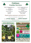 O akham Garden Services Hedge trimming, shaping and reducing Over-grown gardens restored Small tree removals Gravelling Planting Garden clearance and general tidying up Cutting back and pruning Weeding Lawn seeding and tur ng Border restoration Grass cutting Regulargarden maintenance and much more... A l l c a r r i e d o u t p r ofe s s i o n a l ly No j o b t o o s m a l l MOB: 07745 428322 TEL: 01933 663247 Based one mile om Olney 62 Phonebox Magazine