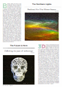 etween winter and early spring are the best times for viewing the world-famous Northern Lights, or 'aurora borealis', and this year is no different. In fact, the best views in decades have been predicted for this winter season, and while seeing the lights can never be guaranteed, as something which features on many people's bucket lists, it is arguably worth taking the trip. While the Northern lights can sometimes be seen from Scotland, the best place to see them is Norway. During January the days are still very short, and although they start to get longer in February and March, there are still maximum chances of viewing the Northern lights in these months. Until April, there is a 90 per cent chance of seeing the lights on a clear day. The Arctic circle in Northern Norway provides the best chance of seeing the lights, as the Northern light belt hits the Lofoten Islands and then follows the coast all the way round. The swirling, magical shapes and colours of the Northern lights are breathtaking, and there is something surreal about seeing colours and shapes in the sky which haven't been put on by a man-made light show, but rather an amazing mystery of nature. There is, of course, a highly detailed scientific explanation for how the aurora borealis come to be, involving highly charged electrons travelling from the sun at millions of miles per hour, and the electrical and magnetic reactions which take place... something which can of course be researched further by those of you particularly interested! Or maybe you would prefer to watch and enjoy the magical Northern lights without knowing the details; perhaps the mystery is all part of the fun... The Northern Lights Predicted For This Winter Season Sarah WaU The Future is Here Following the pace of technology Sarah \' 'all printers, smartwatches and drones - technology seems to be moving faster than each generation can keep up. When you look back over the last few years and see the changes that have taken place, it makes you wonder how much will change again in the coming 1 0 years. You can now print a 3D product in the comfort of your own home, take photos and use your phone from a wristwatch, and now Amazon are saying we may have drones delivering our parcels in the next 1 0 years. It seems the thing of sci-fi films, and can be hard to believe what technology can now do for us. The only way seems to be to embrace it or get left behind- which would mean not being able to function the TV or in the future maybe even accept parcels. Despite the bad press technology in general tends to get; with terms such as 'invading our lives' and 'taking over' cropping up here there and everywhere, the truth is that if all technology were to go down, we would be pretty much non-functional. This 'what if' scenario is a slight worry with the possibility of everything coming crashing down, but resting in the assumption that this is (hopefully) unlikely, the wonders provided through technology are amazing. The technology allowing keyhole surgery, for example, along with countless other healthcare advances, are simply lifesaving. As a result, it is impossible to put down the effects and positives of technology, ratherthe advances need to, somehow, be kept up with. I suppose there will come a time when the changes of technology come to a halt. . . although o n second thoughts, that is seeming less and less likely by the minute! A new announcement from Google is 'moonshot' robots, which will be used in the manufacturing and retail industries. Many jobs are being taken over by machinery nowadays, so perhaps where people in the past were coal miners, the jobs of the future will be robot fixers...how fun. 36 Phonebox Magazine