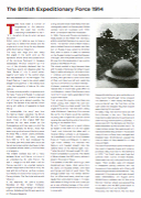 The British Expeditionary Force 1914 There have been a number of programmes on the television over the past few months describing how we went to war in 1914 - but what did we do when war was declared? a long one and would need many men and strategically called the German plan. British soldiers were all volunteers until 1 9 1 6, when conscription was first introduced. British policy for defence was to have a large Navy to defend her shores and the empire and a small Army for any disputes within the Empire or threat to it. In 1894, France and Russia concluded a treaty based on the threat from Germany, which committed Germany to a war on two fronts. The German Chief of Staff made a plan to defeat France in six weeks and then turn on Russia. It was called the Shlieffen Plan, after its author. It called for defence on the Russian border to await the Russian onslaught, which he predicted would come 60 days from the declaration of war, and to attack on the Western Front. The Navy was huge and was easily the largest in the world and, as the diplomatic effo s since the assassination of the Archduke Ferdinand in Sarajevo deteriorated, Winston Churchill as First Lord of the Admiralty declared that the Royal Navy would not disperse after the Naval Review of July. It would remain together and ready for the conflict when war was declared on the 4th August. The Grand Fleet, as it was to be called, sailed straight to Scapa Flow in the Orkney Isles under the leadership of Admiral Sir John Jellicoe. Ourarmywasverysmallincomparisonwith Germany, France and Russia. It comprised of less than a qua er of a million men and half of those were abroad guarding the empire. The German Army was two million strong with millions of rese ists to back this up. This attack entailed a huge hammer blow with the bulk of his forces marching through Belgium while allowing his left side to hold in defence and even move backwards, allowing the right side to come round west of Paris and then turn left and catch the main bulk of the French armies in the rear. Kitchener predicted this manoeuvre and realised that it would take great e ort to hold this plan in check. If the Germans were held, then it would need a great deal of men to push them back. General Smith-Dorrien, who led the Second Corp, found that although he had stopped the Germans in their tracks, the Belgium army to his left and the First Corp on his right under Sir Douglas Haig had slipped away, leaving him exposed. "A contemptible little army" was how the German Kaiser described the British Expeditionary Army (BEF) and the name stuck! Those of the original BEF that survived the war were known as Old Contemptibles and they were proud of the name. Fortunately for Britain, there had been many good reforms of the Army since the Boar War, a dozen years previously. Richard Haldane, the Army minister from 1905 to 1912, had introduced the Territorials, pa -time soldiers who would be trained as normal soldiers but have civilian occupations and be called up in time of war or emergency. From all over the country, more than one million young men heard the call and enlisted. These volunteers would form the largest Army Britain had ever seen, being called Kitchener's New Army. From across the world, the Empire would be sending its young men to fight in Europe and some became the best fighting units of any Army fighting on the western front. In reality, Haig had lost his nerve and left Smith-Dorrien in the lurch. The Second Corp had no alternative but to pull back and start the long march south to Le Gateau. It was a race with the Germans and the men were exhausted by the constant march. make matters worse, they were issued with new boots when they arrived in France and many of them suffered from damaged and blistered feet. Smith-Dorrien coaxed his men on when all they wanted to do was stop and fight. The Entente Cordiale was not a treaty between Britain and France but more of an understanding. Sir John French, the man in charge of the BEF when it left for France, was told in no unce ain terms to remain independent of the French Army. He took with him to France just five divisions, four infantry divisions in two Corp and one Calvary division. The Territorial units would Sir John French was not a good choice as leader of the BEF. He did not speak French and distrusted his allies with a 'Colonel Blimp' attitude to all foreigners. He immediately moved the Army between those of France and Belgium, to sta a 'right hook' o ence. He marched into Belgium and headed straight into the hammer blow of the German right hook. The battle which followed caught Sir John French completely by surprise. The Battle of Mons showed the BEF exactly where it stood in the order of things. The main French thrust came in the east of the country towards Alsace and Lorraine, provinces they had lost to the Germans in 1870. The French army was huge but suffered from narrow minded theories. Attack was their only policy and it cost them dearly. Their soldiers were still d ressed in nineteenth century uniforms with red trousers and blue jackets, and officers still wore white gloves and carried swords. They advanced in huge waves and were mowed down remorselessly. On August 22nd, 26,000 French soldiers died. All this while the main German attack was approaching in the west and the BEF pulled back to recuperate and build up its strength. Fortunately for the French, the two main follow on. The soldiers of the BEF were tough, well disciplined and hardy. Most came from the slums of Industrial Britain, with hard upbringings and lack of good diets. The average soldier was five inches sho er than his officers and many joined up to get regular food and a bed to sleep in. He was well trained in firing his rifle and could put up a very effective barrage of fire which even the hordes of Germans found difficult to cope with. In the meantime, Sir John's superior, Secretary of War Herbert Kitchener, began his recruiting campaign for