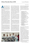 making its way through the road closure! A rst I am sure, and something that is rather dif cult to plan for. I am happy to report the ambulance got through safely and quickly. A very fast race ensued, with victory going to Lianne Fisher in 55.02 seconds. Olney beat Liberal again this year, narrowing the gap in the international competition. Well done to all the ladies that took part. It is promising to note there was a waiting list of runners this year, numbers no doubt swelled by the various Couch to 5K programmes put on by the Olney Runners last year.