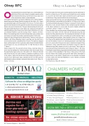 Olney bene ted from another penalty following the kick off and kicked to touch on the visitors 10m line. They won the ball and set up the best move in the Olney back line so far. This took play into the Viper’s ‘22’ and was only stopped by the visitors conceding yet another penalty, Viper’s demonstrating their frustration. Olney kicked for a line out on Viper’s 5m line. They won the ball but had to be satis ed with a scrum when a player ran into the referee. A knock on reversed possession and Vipers had put in at a scrum which they won but a poor clearance kick gave Olney possession. Olney used their threes and Hawken looped to draw the defence and put Harry James in for a try in the corner. The try was not converted and Olney stretched their lead. Olney 22, Vipers 7. (25 mins) Following the restart Vipers progressed and their followers were quietened by a series of three penalties in their favour. Olney were on the back foot and Vipers were making good ground when Brice intercepted a move to pass to Jack Sutton. Hawken was on his shoulder, he passed to Harry James who fed Kane Middleton to score. Hawken converted to wrap up the scores.