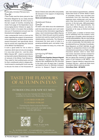 10 Phonebox Magazine | October 2024Indulge in our new Autumn Set Menu in Eyas,available for lunch only, Wednesday to FridayFeaturing the finest seasonal flavours.To view the menu and book your table today,scan the QR below. +44 (0)1604 698005 reception@thefalcon-castleashby.comThe Falcon, Castle Ashby, Northampton, NN7 1LF @falconcastleashbyTASTE THE FLAVOURSOF AUTUMN IN EYASINTRODUCING OUR NEW SET MENU2 COURSES FOR fi393 COURSES FOR fi45Reaff rs%u2019 Le%u001a ersPolitically-minded Pensioners Dear SirI have avidly read the items placed in the Phonebox Magazine by our newly elected Member of Parliament, Mr Chris Curtis in the last couple of months, including the inside front page of the September issue encouraging Senior Citizens to apply for Pension Credit. Is he aware that probably nine out of 10 pensioners are just over the threshold and ineligible to apply?I also contacted Mr Curtis to find out his views regarding the support of pensioners in his constituency, of which there must be several thousand, and specifically about how he would vote regarding the removal of the Winter Fuel Allowance.It took a good while for me to elicit a response, which was not very encouraging. It is now clear where he %u2013 and the other Milton Keynes MP %u2013 stand on pensioners, as they both voted at Westminster in favour of removal of the Winter Fuel Allowance. They voted for their political party and not for their constituents which is disgraceful.I look forward to meeting Mr Curtis one day to discuss his views on the thousands of Senior Citizens who will suffer and possibly die because of his support of dispensing with this benefit.Name and address suppliedSkateboard StatusDear SirIt%u2019s been a fair while since the skateboard park has been discussed, and I can%u2019t seem to find any further information regarding its status. I don%u2019t mind driving to Milton Keynes Bowl, but I think this park would be greatly received and used by myself and the local skateboarding community. The Olympics showcased the best parts of what is a growing worldwide sport, and while it may seem too modern for many, it is, in fact, the future.D. Hart, by emailIntroducing NP MatsDear SirFrom Churches Together, Newport PagnellThe Newport Pagnell Emergency Help Scheme was established by the churches in the town over 40 years ago. It quickly narrowed its focus to offering a transport service to Newport Pagnell residents who had medical appointments, whether those were local or further afield. A team of volunteer drivers was recruited (not exclusively from the churches), whose expenses were reimbursed, and over the years they have provided a much valued service. In the last year, 408 passengers were taken to their appointments, the majority in Milton Keynes, but others to hospitals as far away as Oxford and High Wycombe.In recent years, a number of drivers have had to withdraw from the scheme, some through age or ill health, others because of caring responsibilities. We are now looking to recruit replacements who could drive for us, even occasionally. Full information can be obtained from our Volunteer Coordinator, Dave Maynard, on 07947 020169. He will arrange for prospective drivers to be DBS checked and covered by our Public Liability Insurance (drivers need to have their own motor insurance and be covered for volunteer driving %u2013 not usually a problem).We are taking this moment to update the name of the scheme to NP MATS %u2013 the Newport Pagnell Medical Appointments Transport Service %u2013 which we think more accurately reflects what we provide.Chris Row, Chair %u2013 NP MATS