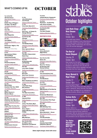 October 2024 | Phonebox Magazine 13Dates might change: check with venueWHAT%u2019S COMING UP IN: OCTOBEROctober highlightsLady Nade Sings Nina SimoneFriday 18 October, 8pmLady Nade pays tribute to the high priestess of soul, Nina Simone, performing classic tracks with her band including I Wish I Knew How, Ain%u2019t Got No, I Got Life and Mr Bojangles.The Best of Vonda ShepardSaturday 19 October, 8pmBest known for her work on the hit TV show Ally McBeal, Vonda Shepard is returning to the UK with her full band to play a set of greatest hits and favourites from her many albums.Henry Normal & Nigel PlanerTuesday 22 October, 8pmComedy legend Nigel Planer (The Young Ones) joins BBC Radio 4%u2019s %u2018poet in reticence%u2019 Henry Normal (The Royle Family, Alan Partridge) for an entertaining evening of poetry, stories, jokes and fun.Seckou Keita Homeland TourSunday 27 October, 8pmSeckou Keita is a renowned kora virtuoso who stands as a luminary among African traditional musicians. With an electrifying seven-piece band of influential Senegalese musicians, this promises to be an explosive live show!The StablesWavendonMilton KeynesMK17 8LU Box office: 01908 280800stables.orgTue 1st-Sat 5th101 DalmatiansMilton Keynes TheatreTue 1stRUSH: King of Reggae %u2013 The Man, The MusicThe Stables, WavendonThu 3rdTom VekBedford EsquiresThu 3rdSteel MagnoliasThe Place Theatre, BedfordThu 3rdTom McRaeThe Stables, WavendonFri 4thPerformers%u2019 Night @ The Song LoftYork House Centre, Stony StratfordFri 4thSpontaneous Potter: The Unoff cial Improvised ParodyThe Quarry Theatre, BedfordFri 4thFlamenco ExpressThe Place Theatre, BedfordSat 5thUK Foo FightersRoadmender, NorthamptonSat 5thSwiftogeddonCraufurd Arms, WolvertonSat 5thKane Brown: Don%u2019t Listen To MeThe Quarry Theatre, BedfordSun 6thMarty Wilde: Greatest Hits Tour 2024The Stables, WavendonSun 6thMilton Keynes in Words & MusicStantonbury Theatre, Milton KeynesTue 8thSounds of the 60s Live %u2013 hosted by Tony BlackburnAylesbury Waterside TheatreWed 9thPeppa Pig%u2019s Fun Day OutCastle Theatre, WellingboroughWed 9thDekkerBedford EsquiresWed 9th-Fri 11thTalking Heads %u2013 Soldiering On and Her Big ChanceThe Place Theatre, BedfordWed 9thPhilharmonia ConcertBedford Corn ExchangeFri 11thJohn Richardson and FriendsAylesbury Waterside TheatreFri 11thChris Kent: Back At ItThe Quarry Theatre, BedfordFri 11thFast Love %u2013 A Tribute To George MichaelBedford Corn ExchangeSat 12th-Sat 19thChicagoMilton Keynes TheatreSat 12thThe Bubble Show!Stantonbury Theatre, Milton KeynesSun 13thSteve Ignorant BandBedford EsquiresSun 13thThe Elvis Tribute Artist World TourAylesbury Waterside TheatreWed 16thAn Evening with Jeffl StellingCastle Theatre, WellingboroughWed 16thLarry Dean: DodgerBedford Corn ExchangeThu 17thRich Hall: Shot From CannonsBedford Corn ExchangeFri 18thMark Chadwick (Levellers)Craufurd Arms, WolvertonFri 18thLady Nade Sings Nina SimoneThe Stables, WavendonFri 18thThe Style CouncillorsRoadmender, NorthamptonFri 18thHayseed DixieBedford EsquiresFri 18thJenny %u2018The Vixen%u2019 RyanStantonbury Theatre, Milton KeynesSat 19thShaun Ryder %u2013 Happy Mondays and Fridays Castle Theatre, WellingboroughSat 19thBiffl y McClyroCraufurd Arms, WolvertonMon 21st-Sat 26thAn Off cer and a Gentleman The MusicalMilton Keynes TheatreTue 22ndJuliette Burton: HopepunkThe Quarry Theatre, BedfordTue 22ndShowman %u2013 An Evening with Anton du BekeCastle Theatre, WellingboroughTue 22nd-Sat 26thCluedo 2 %u2013 The Next ChapterAylesbury Waterside TheatreEDITOR%u2019S PICKTue 22ndHenry Normal & Nigel PlanerThe Stables, WavendonWed 23rd-Sat 26thSister ActStantonbury Theatre, Milton KeynesTue 24thRock On, Tommy %u2013 An Evening with Tommy CannonCastle Theatre, WellingboroughFri 25thThe Concessions Live!York House Centre, Stony StratfordSat 26thThe BluetonesRoadmender, NorthamptonSun 27thFreya BeerCraufurd Arms, WolvertonSun 27thMillie Manders & The Shut UpBedford EsquiresSun 27thKickmouse MysteriumThe Place Theatre, BedfordMon 28thThe Australian Pink FloydMilton Keynes TheatreMon 28thAlbert Lee: 80th Birthday TourThe Stables, WavendonTue 29thSteve Backshall %u2013 OceanMilton Keynes TheatreThu 31stThe StrumbrellasCraufurd Arms, WolvertonTue 31stComedy Club 4 Kids Halloween SpecialThe Quarry Theatre, Bedford