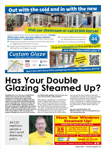 October 2024 | Phonebox Magazine 15Replace the pane, not the frame!All glazing backed by ourHave Your Windows Steamed Up?Social distancing in operation Faulty locks, handles or hinges?Priority freephonewww.cloudy2clear.co.ukLove Your Home - Protect Your Windows - Save Money%u201cI really liked the fact that they were a local community run business%u201dJanet BeardWe are a Which?Trusted TraderHas Your Double Glazing Steamed Up?Established for over 16 years, Cloudy2Clear windows have become the UK%u2019s leading company for domestic glass replacement. Customers are no longer needing to risk their windows by using the dreaded double glazing cowboy down the road, instead, now they can join over 320,000 happy customers and have their glass replaced in an affordable and ethical manner. Remember, a failed glass unit may no longer provide you with the protection you need or be energy efficient. Why not spend a few minutes checking your home to see if you have any failed double glazing? If you act now you can avoid any future costly problems.When talking to the Manager of Cloudy2Clear windows Stephen Moon it became clear that these values have been held dear for a number of years. Since starting the business some years ago Cloudy2Clear have remained true to their core values of supporting the local community by providing a service that saves the public money.The Cloudy2Clear service only requires the glass to be replaced and not the whole window once the unit has failed. Stephen commented %u201cCloudy2Clear were able to assist our community through the last financial crisis in 2008 due to the savings that can be made in using our service. Unfortunately we might be going through something similar again soon and the public can rest assured that we will be there to help once again%u201d.For a free quotation please call 0800 61 21 118 or visit www.cloudy2clear.comwww.cloudy2clear.comAll C2C employees operate a strict social distancing policy.Registered CompanyVisit our indoor showroom for the largest selection of energy efficient door styles, door glass options, windows, conservatories and extensions in the Milton Keynes area%uf0fe We guarantee to give our best price first time every time, no haggling back and forth on price!%uf0fe Honest sound advice from our team of advisors offering free no obligation quotesVisit our showroom or call 01908 650140Open 6 days (Mon-Sat) at Unit 8, Denbigh Hall Ind. Estate, Milton Keynes, MK3 7QTDenbigh Hall Drive Denbigh Hall DriveWatling Street V4Standing Way H8 A421 A5Denbigh Hall Denbigh HallWhaddon WayOr go to customglaze.co.uk to arrange a quoteNowinour44thYearof improving your home44 s%uf0fe Exceptional aftercare service from our dedicated service engineers%uf0fe Now in our 43rd year of tradingOver 6000 positive reviews online ShowroomOpen 6 Days a WeekOut with the cold and in with the new
