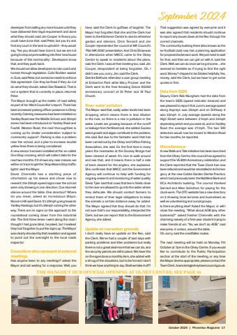 October 2024 | Phonebox Magazine 17September 2024developer from selling any more houses until they have delivered their legal requirement and done what they should, said Jim Cooper. In theory you could have done that, said Peter, but you try and fi nd any court in the land to uphold it %u2013 they would say, %u2018Yes you should have done it, but we are not going to stop anyone walking into their new house because of this technicality%u2019. Developers know that, and they push back. We should not allow developers to ride coach and horses through legislation, Colin Rodden waded in. Sure, said Peter, but someone needs to enforce that agreement. Can they be fi ned if they do not do what they should, asked Dan Rowland. That is not a system that is currently in place, returned Peter.The Mayor brought up the matter of road safety as part of her Ward Councillor%u2019s report. There has been increased parking offi cer presence in Olney recently. Calming measures had been installed on Yardley Road near the Middle School, and 20mph zones had been introduced on Yardley Road and Foxhill. Weston Road, the next thoroughfare is coming up for similar consideration %u2018subject to community support%u2019. Parking is also a problem near the school, and a plan to increase double yellow lines there is being considered.A new sensor has been installed at the so-called One Stop crossing, which will collect data for the next two months. If it shows any near-misses, we will be on track to get the %u2018Stop Means Stop traffi c lights%u2019 said the Mayor.David Chennells has a startling piece of information up his sleeve and chose now to reveal it: the 20mph speed signs near the school were only showing in one direction. Cue stunned silence around the table. One direction? Where do you mean, asked an incredulous Mayor. Moore%u2019s Hill said David. It%u2019s 20mph going towards Yardley Hastings, but it%u2019s 30mph coming the other way. There are no signs on the approach to the roundabout coming down from the industrial site. The fi rst three times I went along the road I thought I had gone blind, he joked, but I realised they had forgotten to put the signs up. The Mayor was clearly shocked by that revelation and agreed to point out the oversight to the local roads inspector.Councillors who represent at external meetingsHas anyone been to any meetings? asked the Mayor and sat waiting for a response. Well, you have, said the Clerk to guff aws of laughter. The Mayor had forgotten that she and the Clerk had been to the Kitchener Centre to see its refreshed garden and interiors. Chris Tennant and Jim Cooper represented the council at MK Council%u2019s %u2018Plan MK 2050%u2019 presentation. And Chris Shaw was in attendance when MKCC came to the Olney Centre to speak to residents about the plans, said the Clerk. I was at that meeting too, said Jim Cooper, despondent at being forgotten. Oh, I didn%u2019t see you, sorry Jim, said the Clerk.Deirdre Bethune attended a user group meeting at Emberton Park while Mary Prosser and the Clerk went to the final Amazing Grace AG250 anniversary concert at St Peter and St Paul Church.River water pollutionThe Mayor said that, sadly, water levels had been dropping, which means there is less dilution in the river, so there is a rise in pollution in the water. Levels are growing because of the runoff or leakage from fertilised soil, she added. Excess weed growth and algae contribute to the problem, she said. But due to the fantastic work that has been carried out by the Olney and Clifton Fishing Association, she said, for the fi rst time in many years the riverbanks at the Goosey Bridge had been cleared of weed. It%u2019s nice to walk around and see that, and it means there is half a mile of bank cleared for the anglers, she explained. She confi rmed that MKCC and the Environment Agency will continue to help with funding for ongoing research and monitoring of water quality.David Tyler said that cows that live in fi elds close to the river are allowed to go into the water where they defecate. We should contact farmers to remind them of their legal obligations to keep the animals a certain distance away, he added. The Mayor agreed that they should do that. I%u2019m not sure that%u2019s our responsibility, interjected the Clerk, but we can report that to the Environment Agency, she added.Update on recreation groundsI don%u2019t really have an update on the Rec, said the Clerk. We%u2019ve had a couple of bad days with parking problems and litter problems but really there is not a great deal more that we can do, and the security patrols are still in place. We have this on the agenda as a monthly item, she added with a shrug of the shoulders, but to be honest I don%u2019t think we have anything to say. Shall we take it off ? That suggestion was agreed by everyone and it was also agreed that residents should continue to report any issues down at the Rec through the correct channels.The community building there (also known as the ex-football club) now has a planning application for proposed extension work. We just need to wait for that, and then we can get on with it, said the Clerk. Well, we can do once we%u2019ve got some%u2026 she seemed to hesitate as if trying to fi nd the right word. Money? chipped in Ian Stokes helpfully. Yes, money, said the Clerk, but we have to get some quotes in fi rst.Data from SIDSDeputy Clerk Rob Mungham had the data from the town%u2019s SIDS (speed indicator devices) and was pleased to report that June%u2019s average speed along Aspreys was 25mph and on Driftway it was 22mph. In July average speeds along the High Street were between 21mph and 24mph depending which end you were at, and on Yardley Road the average was 21mph. The two SID detectors would now be moved to Weston Road for two months, he reported.MiscellaneousA new Walk and Talk initiative has been launched from the Olney Centre, the council has agreed to support the VE 80th Anniversary celebration, and 
