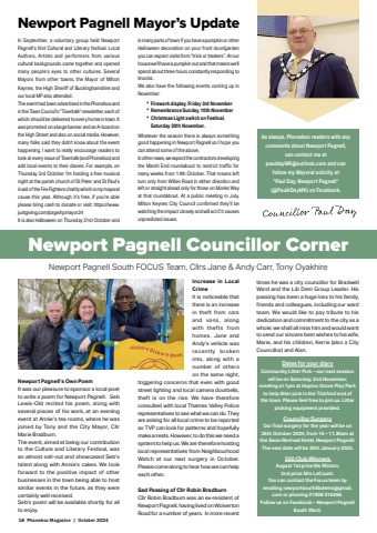 18 Phonebox Magazine | October 2024Newport Pagnell Mayor%u2019s UpdateNewport Pagnell Councillor CornerDates for your diaryCommunity Litter Pick %u2013 our next session will be on Saturday, 2nd November, meeting at 1pm at Hopton Grove Play Park to help litter pick in the Tickford end of the town. Please feel free to join us. Litter picking equipment provided. Councillor SurgeryOur fi nal surgery for the year will be on 26th October 2024, from 10 %u2013 11.30am at the Swan Revived Hotel, Newport Pagnell. The next date will be 25th January 2025.200 Club Winners August 1st prize Ms Winton, 2nd prize Mrs LeCount.You can contact the Focus team by emailing newportsouthlibdems@gmail.com or phoning 01908 216366. Follow us on Facebook %u2013 Newport Pagnell South Ward. Newport Pagnell South FOCUS Team, Cllrs Jane & Andy Carr, Tony OyakhireNewport Pagnell%u2019s Own PoemIt was our pleasure to sponsor a local poet to write a poem for Newport Pagnell. %u00a0 Seb Lewis-Old recited his poem, along with several pieces of his work, at an evening event at Annie%u2019s tea rooms, where he was joined by Tony and the City Mayor, Cllr Marie Bradburn.%u00a0 The event, aimed at being our contribution to the Culture and Literary Festival, was an almost sell-out and showcased Seb%u2019s talent along with Annie%u2019s cakes.%u00a0We look forward to the positive impact of other businesses in the town being able to host similar events in the future, as they were certainly well received.Seb%u2019s poem will be available shortly for all to enjoy. %u00a0 Increase in Local CrimeIt is noticeable that there is an increase in theft from cars and vans, along with thefts from homes.%u00a0 Jane and Andy%u2019s vehicle was recently broken into, along with a number of others on the same night, triggering concerns that even with good street lighting and local camera doorbells, theft is on the rise.%u00a0 We have therefore consulted with local Thames Valley Police representatives to see what we can do. They are asking for all local crime to be reported so TVP can look for patterns and hopefully make arrests. However, to do this we need a system to help us. We are therefore hosting local representatives from Neighbourhood Watch at our next surgery in October. Please come along to hear how we can help each other. Sad Passing of Cllr Robin Bradburn Cllr Robin Bradburn was an ex-resident of Newport Pagnell, having lived on Wolverton Road for a number of years. In more recent times he was a city councillor for Bradwell Ward and the Lib Dem Group Leader. His passing has been a huge loss to his family, friends and colleagues, including our ward team. We would like to pay tribute to his dedication and commitment to the city as a whole; we shall all miss him and would want to send our sincere best wishes to his wife, Marie, and his children, Kerrie (also a City Councillor) and Alan. In September, a voluntary group held Newport Pagnell%u2019s fi rst Cultural and Literary festival. Local Authors, Artists and performers from various cultural backgrounds came together and opened many people%u2019s eyes to other cultures. Several Mayors from other towns, the Mayor of Milton Keynes, the High Sheriff of Buckinghamshire and our local MP also attended.The event had been advertised in the Phonebox and in the Town Council%u2019s %u201cTowntalk%u201d newsletter, each of which should be delivered to every home in town. It was promoted on a large banner and an A-board on the High Street and also on social media. However, many folks said they didn%u2019t know about the event happening. I want to really encourage readers to look at every issue of Towntalk (and Phonebox) and add local events to their diaries. For example, on Thursday 3rd October I%u2019m hosting a free musical night at the parish church of St Peter and St Paul%u2019s in aid of the Fire Fighters charity which is my mayoral cause this year. Although it%u2019s free, if you%u2019re able please bring cash to donate or visit: https://www.justgiving.com/page/npmayor24 It is also Halloween on Thursday 31st October and in many parts of town if you have a pumpkin or other Halloween decoration on your front door/garden you can expect visits from %u201ctrick or treaters%u201d. At our house we%u2019ll have a pumpkin out and that means we%u2019ll spend about three hours constantly responding to knocks. We also have the following events coming up in November:*%u2002Firework display, Friday 3rd November *%u2002Remembrance Sunday, 10th November*%u2002 Christmas Light switch on Festival, Saturday 30th November.Whatever the season there is always something good happening in Newport Pagnell so I hope you can attend some of the above.In other news, we expect the contractors developing the Marsh End roundabout to restrict traffi c for many weeks from 14th October. That means left turn only from Willen Road in either direction and left or straight ahead only for those on Monks Way at that roundabout. At a public meeting in July, Milton Keynes City Council confi rmed they%u2019ll be watching the impact closely and will act if it causes unpredicted issues.As always, Phonebox readers with any comments about Newport Pagnell, can contact me at pauldayMK@outlook.com and can follow my Mayoral activity at %u201cPaul Day, Newport Pagnell%u201d (@PaulkDayMK) on Facebook.