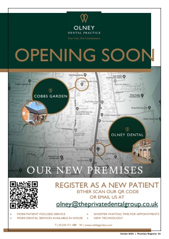 October 2024 | Phonebox Magazine 23OPENING SOONREGISTER AS A NEW PATIENTEITHER SCAN OUR QR CODE OR EMAIL US AT olney@theprivatedentalgroup.co.ukT | 01234 711 489 W | www.cobbsgarden.com%u2022 SHORTER WAITING TIME FOR APPOINTMENTS%u2022 NEW TECHNOLOGY%u2022 MORE PATIENT FOCUSED SERVICE%u2022 MORE DENTAL SERVICES AVAILABLE IN HOUSE