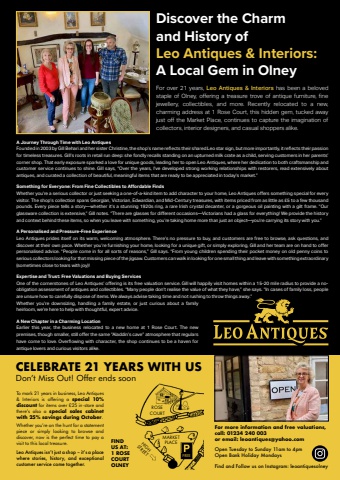 October 2024 | Phonebox Magazine 25Discover the Charm and History of Leo Antiques & Interiors:A Local Gem in OlneyFor over 21 years, Leo Antiques & Interiors has been a beloved staple of Olney, offering a treasure trove of antique furniture, fine jewellery, collectibles, and more. Recently relocated to a new, charming address at 1 Rose Court, this hidden gem, tucked away just off the Market Place, continues to capture the imagination of collectors, interior designers, and casual shoppers alike.A Journey Through Time with Leo AntiquesFounded in 2003 by Gill Behari and her sister Christine, the shop%u2019s name reflects their shared Leo star sign, but more importantly, it reflects their passion for timeless treasures. Gill%u2019s roots in retail run deep: she fondly recalls standing on an upturned milk crate as a child, serving customers in her parents%u2019 corner shop. That early exposure sparked a love for unique goods, leading her to open Leo Antiques, where her dedication to both craftsmanship and customer service continues to shine. Gill says, %u201cOver the years, I%u2019ve developed strong working relationships with restorers, read extensively about antiques, and curated a collection of beautiful, meaningful items that are ready to be appreciated in today%u2019s market.%u201dSomething for Everyone: From Fine Collectibles to Affordable FindsWhether you%u2019re a serious collector or just seeking a one-of-a-kind item to add character to your home, Leo Antiques offers something special for every visitor. The shop%u2019s collection spans Georgian, Victorian, Edwardian, and Mid-Century treasures, with items priced from as little as %u00a35 to a few thousand pounds. Every piece tells a story%u2014whether it%u2019s a stunning 1920s ring, a rare Irish crystal decanter, or a gorgeous oil painting with a gilt frame. %u201cOur glassware collection is extensive,%u201d Gill notes. %u201cThere are glasses for different occasions%u2014Victorians had a glass for everything! We provide the history and context behind these items, so when you leave with something, you%u2019re taking home more than just an object%u2014you%u2019re carrying its story with you.%u201dA Personalised and Pressure-Free ExperienceLeo Antiques prides itself on its warm, welcoming atmosphere. There%u2019s no pressure to buy, and customers are free to browse, ask questions, and discover at their own pace. Whether you%u2019re furnishing your home, looking for a unique gift, or simply exploring, Gill and her team are on hand to offer personalised advice. %u201cPeople come in for all sorts of reasons,%u201d Gill says. %u201cFrom young children spending their pocket money on old penny coins to serious collectors looking for that missing piece of the jigsaw. Customers can walk in looking for one small thing and leave with something extraordinary (sometimes close to tears with joy)!Expertise and Trust: Free Valuations and Buying ServicesOne of the cornerstones of Leo Antiques%u2019 offering is its free valuation service. Gill will happily visit homes within a 15-20 mile radius to provide a noobligation assessment of antiques and collectibles. %u201cMany people don%u2019t realise the value of what they have,%u201d she says. %u201cIn cases of family loss, people are unsure how to carefully dispose of items. We always advise taking time and not rushing to throw things away.%u201dWhether you%u2019re downsizing, handling a family estate, or just curious about a family heirloom, we%u2019re here to help with thoughtful, expert advice.A New Chapter in a Charming LocationEarlier this year, the business relocated to a new home at 1 Rose Court. The new premises, though smaller, still offer the same %u201cAladdin%u2019s cave%u201d atmosphere that regulars have come to love. Overflowing with character, the shop continues to be a haven for antique lovers and curious visitors alike.CELEBRATE 21 YEARS WITH USDon%u2019t Miss Out! Offer ends soonFor more information and free valuations,call: 01234 240 003 or email: leoantiques@yahoo.comOpen Tuesday to Sunday 11am to 4pmOpen Bank Holiday MondaysFind and Follow us on Instagram: leoantiquesolneyTo mark 21 years in business, Leo Antiques & Interiors is offering a special 10% discount for items over %u00a325 in-store and there%u2019s also a special sales cabinet with 25% savings during October. Whether you%u2019re on the hunt for a statement piece or simply looking to browse and discover, now is the perfect time to pay a visit to this local treasure. Leo Antiques isn%u2019t just a shop %u2013 it%u2019s a place where stories, history, and exceptional customer service come together. MARKETPLACEROSECOURTFREEHIGH STREETFIND US AT: 1 ROSE COURTOLNEY
