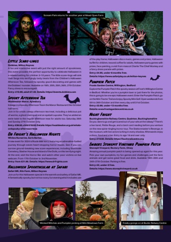 October 2024 | Phonebox Magazine 33Little Scare-lingsDobbies, Milton KeynesA fun and interactive event with just the right amount of spookiness, this event provides the perfect opportunity to celebrate Halloween in a relaxed setting for children 3-10 years. The little scare-lings will sink their fangs into terrifyingly tasty treats from the Children%u2019s Halloween Afternoon Tea, followed by spooky gourd decorating and games with the Dobbies%u2019 monster. Available on 19th, 20th, 25th, 26th, 27th October. Fancy dress is encouraged! Entry: %u00a310.99, adult %u00a37.40. Details: https://events.dobbies.comSpooky Afternoon TeaWaddesdon Manor, AylesburyIndulge in a Spooky Afternoon Tea in the Manor Restaurant this October half-term.Join in for a kids creepy afternoon tea treat, including a delicious pot of worms, a ghost meringue and an eyeball cupcake. They%u2019ve added an eerie twist to the regular afternoon teas for adults too. Saturday 26th and Sunday 27th October only.Entry: %u00a336.50, child %u00a318.50. Details: https://waddesdon.org.uk/whatson/spooky-afternoon-teasDr Fright%u2019s Halloween NightsWhites Nurseries, Earls BartonA new event for 2024 is Route 666 Vol 2, featuring an adrenaline-fuelled journey through seven heart-stopping horror mazes. See if you can survive ground-breaking new scare experiences, including Stormvale Cemetery, Slasher House and Island of the Dolls, on this terrifying night. At the end, visit the Horror Bar and watch other poor victims on live webcam. From 17th October to 2nd November.Entry: from %u00a321.95. Details: https://www.drfrights.comHalloween Spooktacular at SafariSafari MK, Kiln Farm, Milton KeynesJoin us for this Halloween special in the warmth and safety of Safari MK. A fantastically spooky, but not too scary, fun evening which includes use of the play frame, Halloween disco music, games and prizes, Halloween buff et for children, tea and coff ee for adults, Halloween party games with prizes, face painting, a visit from mascot Charlie The Chief Monkey and a fancy dress parade with prizes.Entry: %u00a34.95, under-6 months free.Details: https://www.safariplay.co.uk/milton-keynesPumpkin PatchFrosts Garden Centre, Willington, BedfordExplore the Pumpkin Patch this spooky season at Frost%u2019s Willington Centre in Bedford. Whether you%u2019re a pumpkin lover or just there for the photos, this is going to be one epic Halloween event. Enter the Pumpkin Patch, go on the Mini Tractor Trail and enjoy Spooky Mini Golf. Open weekends from 5th to 26th October and then every day until 31st October.Entry: %u00a33.99, under-12 months free. Details: www.frostsgardencentres.co.ukNight FrightBuckinghamshire Railway Centre, Quainton, BuckinghamshireDo you dare to go and get scared out of your wits at the railway? There%u2019s a live band, Petite Rouge, and a tarot card reading before you venture on the new spine-tingling horror tour, The Stationmaster%u2019s Revenge, in the museum, with live actors lurking in every shadow. Afterwards enjoy a disco, food and a bar. Entry to age 16 and over only.Entry: %u00a319.50. Details: https://bucksrailcentre.orgEmbers Stonepit Vineyard Pumpkin PatchStonepit Vineyard, Rectory Farm, Olney Amazing annual pumpkin patch is being opened up again for this year. Pick your own pumpkins, try fun games and challenges, pet the farm animals and get some great food and drink. Available 19th-20th and 24th-27th October. Parking is free.Entry: %u00a32, under-3 free.Details: https://www.stonepitvineyard.co.ukScream Park returns for another year at Mead Open FarmWicked Witches and Pumpkin picking at Mini Meadows Farm Freaky goings on at Bucks Railway Centre