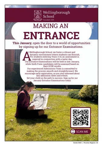October 2024 | Phonebox Magazine 35t Wellingborough School, we foster a vibrant and Adynamic environment where students can flourish,For students entering Years 3-10, an assessment isrequired in conjunction with a taster day.Our Entrance Examinations will be held in late January,while Sixth Form candidates will be assessed based ontheir GCSE results.Our experienced Admissions Team is committed tomaking the process smooth and straightforward. Weencourage early registration, so you stay informed aboutkey admission dates and events.Set your child on the path to success. Sign up for ourJanuary Entrance Examinations today.MAKING ANENTRANCEThis January, open the door to a world of opportunitiesby signing up for our Entrance Examinations.