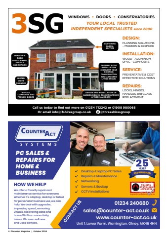 4 Phonebox Magazine | October 2024WINDOWS %u2022 DOORS %u2022 CONSERVATORIESYOUR LOCAL TRUSTED INDEPENDENT SPECIALISTS since 2000DESIGN AND INSTALLATION OF GARDEN ROOMS, CONSERVATORIES & THERMAL ROOFSWINDOW & DOOR REPLACEMENT, SERVICE AND REPAIRSBI-FOLD, COMPOSITE AND FRENCH DOORSMISTED UNITS CHANGED GUTTERING FASCIA SOFFITS THERMAL ROOF INSTALLATION(CONVERT YOUR EXISTING CONSERVATORY INTO A MODERN LIVING SPACE) Call us today to find out more on 01234 712242 or 01908 980068Or email info@3shiresgroup.co.uk @threeshiresgroupDESIGN:PLANNING SOLUTIONS %u2013 MODERN & BESPOKEINSTALLATION:WOOD - ALUMINIUM - UPVC - COMPOSITE SERVICE:PREVENTATIVE & COST EFFECTIVE SOLUTIONSREPAIRS:LOCKS, HINGES, HANDLES and GLASS REPLACEMENTDesktop & Laptop PC SalesNetworkingRepairs & MaintenanceCONTACT US01234 240680PC SALES &REPAIRS FORHOME &BUSINESSServers & BackupCCTV Installationswww.counter-act.co.ukWe offer a friendly repair &maintenance service foreveryone. Whether it's a laptop,desktop or tablet for personalor business use, we can helpwith upgrades, improvingspeed, removing viruses,recovering data & home Wi-Fior connectivity issues.We even sell new & useddevices.HOW WE HELPUnit 1, Lower Farm, Warrington,Olney, MK46 4HNPC SALES &REPAIRS FORHOME &BUSINESSHOW WE HELPWe offer a friendly repair and maintenance service for everyone. Whether it%u2019s a laptop, desktop or tablet for personal or business use, we can help. We deal with upgrades, improving speed, removing viruses, recovering data and home Wi-Fi or connectivity issues. We even sell new and used devices.Desktop & laptop PC SalesRepairs & MaintenanceNetworkingServers & BackupCCTV InstallationsCONTACT US 01234 240680 sales@counter-act.co.ukwww.counter-act.co.ukUnit 1, Lower Farm, Warrington, Olney, MK46 4HNESTABLISHED