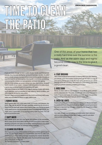 42 Phonebox Magazine | October 2024One of the areas of your home that has a really hard time over the summer is the patio. And as the warm days and nights become cooler, now is the time to give it a good clean.TIME TO CLEAN THE PATIO If you are lucky enough to have a patio at your house, you%u2019ll know how popular they become during the spring and summer months. A useful space, usually between the back of the home and the garden, the patio is a perfect area for al fresco eating, relaxing with a cool drink, sunbathing, entertaining the children and grandchildren and even star gazing.And all of this activity can prove messy over time. Spilt drinks, dropped food, a splash of sun cream %u2013 it doesn%u2019t take long before the patio needs a good clean to bring it back to its sparkling self again.And even if there is not much in the way of staining, a patio still needs some attention, such as weeding, to help keep it in good condition and off ering great service for many years.You don%u2019t need a pressure washer to do this. And it can be done with soapy water and not a drop of bleach in sight. Here%u2019s ho1. REMOVE WEEDS When weeds take root under patio slabs and bricks, and between the joints, they can do serious damage, gradually weakening the structure. They must be dealt with before they properly take root. Pull up as much of the weed and its root as possible by hand. To tackle tough weeds, you might need a weed killer, or try pouring boiling water on them. This will blanch and kill the roots.2. SOAPY WATER With weeds gone, you can now tackle the surface of the stonework. Most of this can be done with a stiff brush and some warm, soapy water. Washing up liquid is one option but whatever cleaning fl uid you use, check the instructions as some can damage paving materials.3. CLEANING SOLUTION ONStart by pouring some of the solution on the patio and then give it a good scrub. If in any doubt always try a small hidden area fi rst to make sure there%u2019s going to be no lasting damage caused by the cleaner. Scrub the area and rinse down initially with clean water. Try to brush the soapy liquid away from plants and shrubs.PHONEBOX GARDENING4. START BRUSHINGTake a hard-bristled brush and start scrubbing. When you start cleaning, you should notice the bristles breaking through the stains on top of your paving stones fairly easily. But keep going as hard as you can to dislodge all the dirt and mess. This keeps your patio looking clean while helping to prevent weeds by stopping germination.5. RINSE DOWNPlenty of clean water is now needed to rinse off the grimy solution and its disturbed dirt. The patio should look noticeably improved in looks. If you%u2019re not happy, let it all dry and then repeat the process, concentrating on the areas that you weren%u2019t happy with.6. CHECK THE JOINTSKeeping the joints clean is also important as they can also be damaged by weeds and muck, and start to break up. Regular sweeping and weed removal is important but any gaps created by this should be re-fi lled as soon as possible.Your patio should now be looking markedly better than it did and, with any minor gaps and holes fi lled, it will be ready for you when next summer comes around.