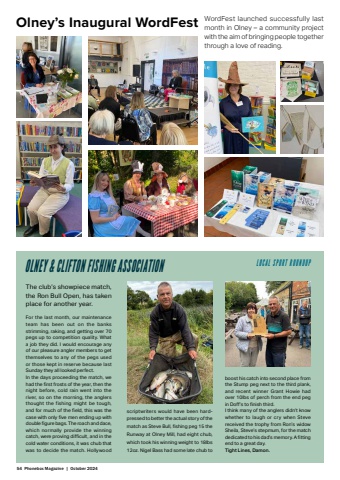 54 Phonebox Magazine | October 2024OLNEY & CLIFTON FISHING ASSOCIATIONThe club%u2019s showpiece match, the Ron Bull Open, has taken place for another year.For the last month, our maintenance team has been out on the banks strimming, raking, and getting over 70 pegs up to competition quality. What a job they did. I would encourage any of our pleasure angler members to get themselves to any of the pegs used or those kept in reserve because last Sunday they all looked perfect.In the days proceeding the match, we had the fi rst frosts of the year, then the night before, cold rain went into the river, so on the morning, the anglers thought the fishing might be tough, and for much of the fi eld, this was the case with only fi ve men ending up with double fi gure bags. The roach and dace, which normally provide the winning catch, were proving diffi cult, and in the cold water conditions, it was chub that was to decide the match. Hollywood LOCAL SPORT ROUNDUPscriptwriters would have been hardpressed to better the actual story of the match as Steve Bull, fi shing peg 15 the Runway at Olney Mill, had eight chub, which took his winning weight to 18lbs 12oz. Nigel Bass had some late chub to boost his catch into second place from the Stump peg next to the third plank, and recent winner Grant Howie had over 10lbs of perch from the end peg in Doff %u2019s to fi nish third.%u00a0I think many of the anglers didn%u2019t know whether to laugh or cry when Steve received the trophy from Ron%u2019s widow Sheila, Steve%u2019s stepmum, for the match dedicated to his dad%u2019s memory. A fi tting end to a great day. Tight Lines, Damon.Olney%u2019s Inaugural WordFest WordFest launched successfully last month in Olney %u2013 a community project with the aim of bringing people together through a love of reading.
