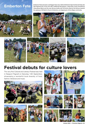 October 2024 | Phonebox Magazine 55OLNEY BOWLING CLUB Text, textThe Jock Smail Cup Winners The Jock Smail Cup Runners upLOCAL SPORT ROUNDUPEmberton Fete Emberton Fete was back, and bigger than ever. Held at Emberton Sports & Social Club, the fete featured lots of tea and cake, traditional fete games, a dog show, music provided by Olney Brass Band, and the now-famous bottle stall. All funds raised at the fete go towards the upkeep of All Saint%u2019s Church, Emberton, an integral part of the village community.Festival debuts for culture loversThe very fi rst Cultural and Literary Festival was held in Newport Pagnell on Saturday 14th September, showcasing a wonderful local diversity of food, fashion, literature and music.