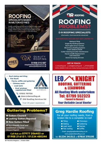 58 Phonebox Magazine | October 2024OOFINGVICESDW Roofing Final.pdf 1 08/09/2020 17:10%u2022 Roof slating and tiling%u2022 Flat Roofs%u2022 Fascia, soffits and guttering%u2022 Chimney work%u2022 Lead work%u2022 Roof windows supplied and fittedOver 20 years%u2019 experience07810 781708dave@dwroofing.ukDW Roofing Services ltdROOFING, GUTTERING & LEADWORKAll Roofing Work undertaken Tel: 07799 552323( based in Bozeat ) LEO KNIGHTGuttering Problems?Call Rob on 07977 206403 or01908 216151 / 01234 480244%u25cf Gutters Cleaned%u25cf Leaking Gutters Repaired%u25cf New Gutters FittedAll by a friendly, local and established company(Newport Pagnell)Greg Hardie RoofingFor all your roofing needs, from abroken tile to a complete re-roof.%u25cf Tiling%u25cf Slating%u25cf Lead work%u25cf Flat roofing%u25cf Chimneys%u25cf Guttering%u25cf Fascias%u25cf SoffitsEmail: greg@greghardieroofing.co.ukwww.greghardieroofing.co.ukTel: 01234 241512 or 07810 370195ROOFINGPROBLEMS?D R ROOFING SPECIALISTSOUR SERVICES INCLUDE BUT NOT LIMITED TO:(Domestic, Commercial & Industrial)Slating & TilingSingle Ply Roofing SystemsRoof Lights & Sun TunnelsBituminous Roofing SystemsGreen (Sedum) RoofsGutter Cleaning & Gutter MaintenanceFascia & Soffit ReplacementLeak DetectionDrone Surveying ServicesGET IN TOUCHdrroofing.net ollie@drroofing.net 07747448683POSTAL ADDRESS: 9 Little Lane, Yardley Hastings, Northampton, NN7 1EN