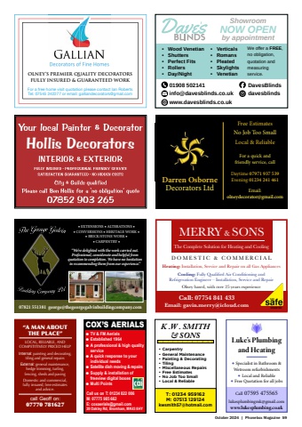 October 2024 | Phonebox Magazine 59Darren OsborneDecorators LtdFree EstimatesNo Job Too SmallLocal & ReliableFor a quick and friendly service, callDaytime 07971 937 539Evening 01234 241 461Email: olneydecorator@gmail.comLOCAL, RELIABLE, AND COMPETITIVELY PRICED HELP Internal: painting and decorating,tiling and general repairsExternal: general maintenance, hedge trimming, turfing, fencing, sheds and pavingDomestic and commercial, fully insured, free estimates and advice.%u201cA MAN ABOUT THE PLACE%u201dcall Geoff on:07770 781627Hollis DecoratorsOlney%u2019s Premier Quality DecoratorsFully Insured & Guaranteed WorkFor a free home visit quotation please contact Ian RobertsTel: 07545 242277 or email: galliandecorators@gmail.comK .W . SMITH& SONS%u2022 Carpentry %u2022 General Maintenance%u2022 Painting & Decorating%u2022 Tiling%u2022 Miscellaneous Repairs%u2022 Free Estimates%u2022 No Job Too Small%u2022 Local & ReliableT: 01234 959162M: 07513 129124kwsmith57@hotmail.comShowroom NOW OPENby appointment%u2022 Wood Venetian%u2022 Shutters%u2022 Perfect Fits%u2022 Rollers%u2022 Day/Night01908 502141info@davesblinds.co.ukwww.davesblinds.co.ukDavesBlindsdavesblinds%u2022 Verticals%u2022 Romans%u2022 Pleated%u2022 Skylights%u2022 VenetianWe offer a FREE, no obligation, quotation and measuring service.%u2019COX%u2019S AERIALS%u25cf TV & FM Aerials%u25cf Established 1964%u25cf A professional & high qualityservice%u25cf A quick response to yourindividual needs%u25cf Satellite dish moving & repairs%u25cf Supply & installation offreeview digital boxes%u25cf Multi PointsCall us on T: 01234 822 006M: 07974 933 526E: coxaerials@gmail.com28 Oakley Rd, Bromham, MK43 8HYCall us on T: 01234 822 006M: 07775 985 662E: coxaerials@gmail.com28 Oakley Rd, Bromham, MK43 8HY%u201cWe%u2019re delighted with the work carried out. Professional, considerate and helpful from quotation to completion. We have no hesitation in recommending them from our experience.%u201d%u25c6 EXTENSIONS %u25c6 ALTERATIONS %u25c6%u25c6 CONVERSIONS %u25c6 HERITAGE WORK %u25c6 %u25c6 BRICK/STONE WORK %u25c6%u25c6 CARPENTRY %u25c607821 551381 george@thegeorgegalvinbuildingcompany.com%u25c6 Specialist in Bathroom & Wetroom refurbishments%u25c6 Local and Reliable%u25c6 Free Quotation for all jobsLuke%u2019s Plumbing and Heatinglukesplumbingmk@gmail.comwww.lukesplumbing.co.ukCall 07595 475565MERRY & SONSThe Complete Solution for Heating and CoolingDOMESTIC & COMMERCIALHeating: Installation, Service and Repair on all Gas AppliancesCooling: Fully Qualified Air Conditioning and Refrigeration Engineer %u2013 Installation, Service and RepairOlney based, with over 25 years experienceCall: 07754 841 433Email: gavin.merry@icloud.com