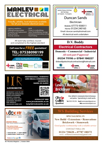 60 Phonebox Magazine | October 2024D.V. BoddyElectrical ContractorsDomestic %u2022 Commercial %u2022 IndustrialAll work part P approved01234 711116 or 07841 196227dvboddyelectricalcontractors@hotmail.comDuncan SandsElectricianMobile: 07773 930011Home: 01234 240165Email: duncan.sands@hotmail.comAll electrical work undertakenINSPECTION & TESTINGPAT TESTINGBT POINTS - TV POINTS Friendly, reliable, local electrician available for all your domestic electrical needs- Lighting installation - Adding/moving sockets - Consumer unit replacement- Ring doorbells- Security cameras- EICR- Power to outbuildings- Solar Panels/Battery storage- Extension/conservatory wiring- Fault findingAll work fully certified, insuredand completed to the highest standard Call now for a quotation!www.manleyelectrical.co.ukTEL: 07538098199Email: john@manleyelectrical.co.ukFREEWS Building ServicesSPECIALISING INNew Build %u2022 Extensions %u2022 RenovationsBrickwork %u2022 StoneworkGood quality workmanship with a reliable serviceCONTACT WILL ON01234 720628 OR 07787 180172email: williamcsconstruction@gmail.comLocally based, 74 High Street, Harrold, Beds MK43 7BHLewis T. RedpathBricklayerAlso skilled in stonework, block driveways and patios. Specialising in small works.Tel 07833 991784 Email lewistredpath@gmail.comQualified Web www.lewistredpath.co.uk24 HOUR LOCKSMITH SERVICESBEDFORDAlastair BatesYour local trusted LocksmithT: 01234 924 997 | M: 07874 285661E: alastair.bates@lockfit.co.ukNo callout chargeFixed pricing guaranteedFast 24/7 responsePROFESSIONAL, DOMESTIC AND SMALL COMMERCIAL LOCKSMITHBASED IN OLNEY07354 017 222www.jirlocksmith.co.ukhelp@jirlocksmith.co.ukEMERGENCY LOCK IN/OUTBROKEN KEY EXTRACTIONMINOR ADJUSTMENTSSECURITY UPGRADESNEW HOME NEW LOCKSADDITIONAL SECURITYNEW INSTALLSSINGLE KEY HOME LIFE