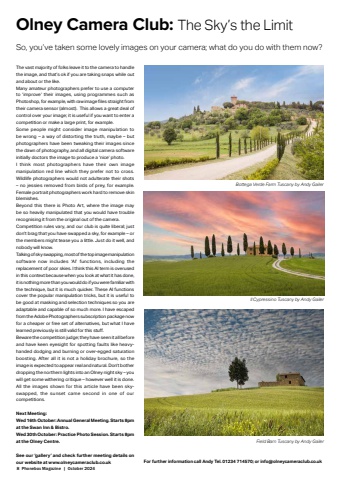 8 Phonebox Magazine | October 2024Olney Camera Club: The Sky%u2019s the LimitThe vast majority of folks leave it to the camera to handle the image, and that%u2019s ok if you are taking snaps while out and about or the like. Many amateur photographers prefer to use a computer to %u2018improve%u2019 their images, using programmes such as Photoshop, for example, with raw image fi les straight from their camera sensor (almost).%u00a0 This allows a great deal of control over your image; it is useful if you want to enter a competition or make a large print, for example.Some people might consider image manipulation to be wrong %u2013 a way of distorting the truth, maybe %u2013 but photographers have been tweaking their images since the dawn of photography, and all digital camera software initially doctors the image to produce a %u2018nice%u2019 photo.I think most photographers have their own image manipulation red line which they prefer not to cross. Wildlife photographers would not adulterate their shots %u2013 no jessies removed from birds of prey, for example. Female portrait photographers work hard to remove skin blemishes.Beyond this there is Photo Art, where the image may be so heavily manipulated that you would have trouble recognising it from the original out of the camera.Competition rules vary, and our club is quite liberal; just don%u2019t brag that you have swapped a sky, for example %u2013 or the members might tease you a little. Just do it well, and nobody will know. Talking of sky swapping, most of the top image manipulation software now includes %u2018AI%u2019 functions, including the replacement of poor skies. I think this AI term is overused in this context because when you look at what it has done, it is nothing more than you would do if you were familiar with the technique, but it is much quicker. These AI functions cover the popular manipulation tricks, but it is useful to be good at masking and selection techniques so you are adaptable and capable of so much more. I have escaped from the Adobe Photographers subscription package now for a cheaper or free set of alternatives, but what I have learned previously is still valid for this stuff .Beware the competition judge; they have seen it all before and have keen eyesight for spotting faults like heavyhanded dodging and burning or over-egged saturation boosting. After all it is not a holiday brochure, so the image is expected to appear real and natural. Don%u2019t bother dropping the northern lights into an Olney night sky %u2013 you will get some withering critique %u2013 however well it is done.All the images shown for this article have been skyswapped, the sunset came second in one of our competitions.Next Meeting: Wed 16th October: Annual General Meeting. Starts 8pm at the Swan Inn & Bistro.Wed 30th October: Practice Photo Session. Starts 8pm at the Olney Centre.See our %u2018gallery%u2019 and check further meeting details on our website at www.olneycameraclub.co.ukSo, you%u2019ve taken some lovely images on your camera; what do you do with them now?Field Barn Tuscany by Andy GailerBottega Verde Farm Tuscany by Andy GailerIl Cypressino Tuscany by Andy GailerFor further information call Andy Tel. 01234 714570; or info@olneycameraclub.co.uk